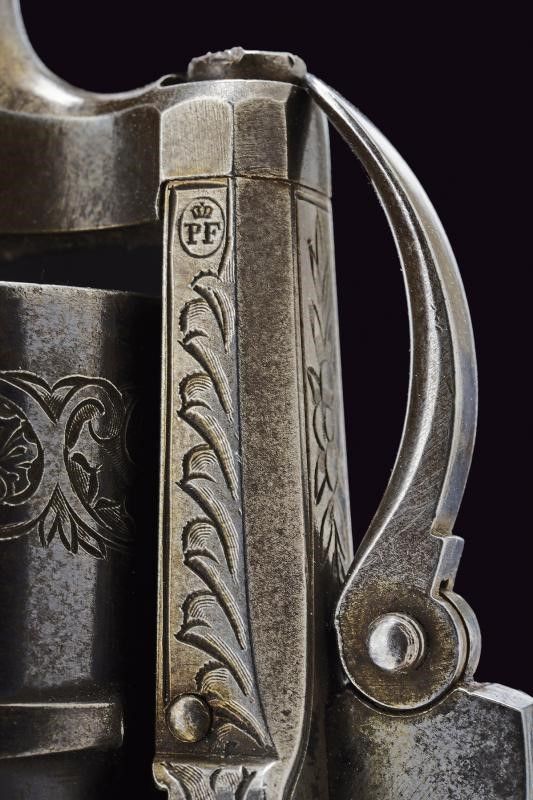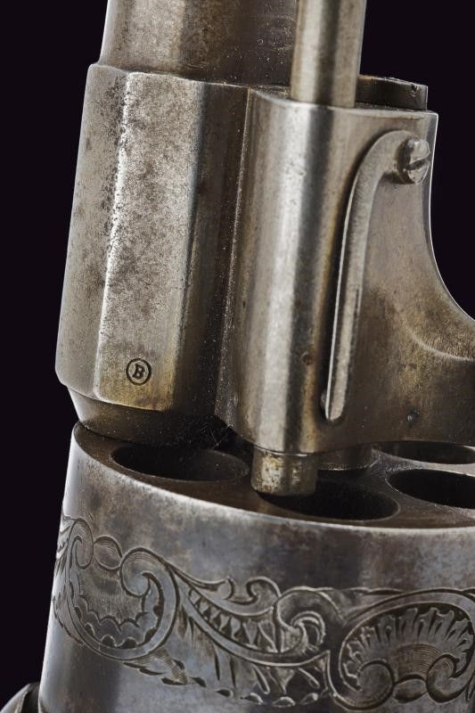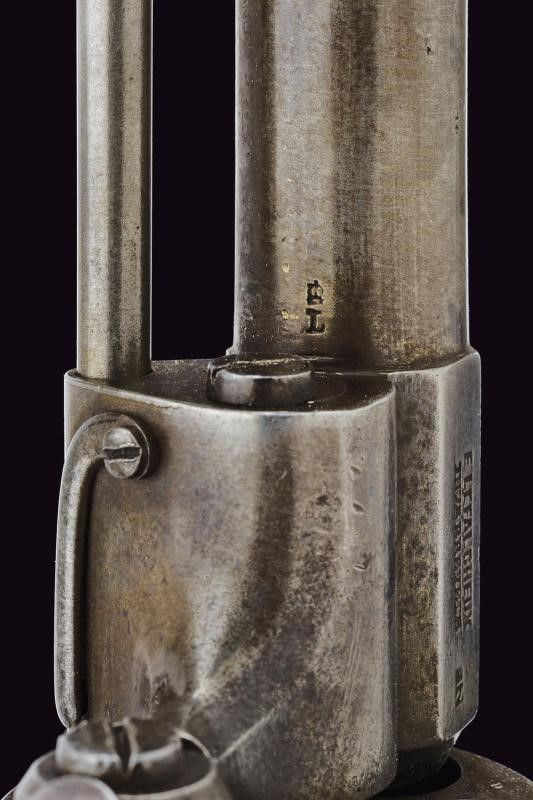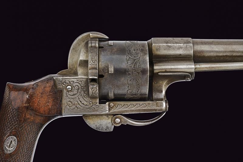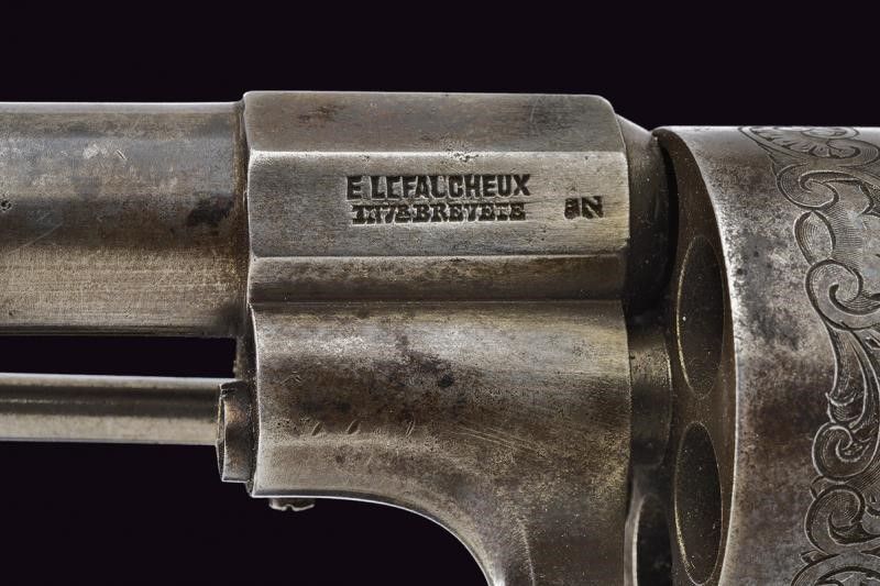 1870 circa Canna rigata, tonda, con base ottagonale, recante marcatura di Lefaucheux, mirino, in cal. 11 mm. Tamburo a sei colpi, liscio, brunito, inciso a motivi floreali e con punzone del banco di prova di Liegi. Castello decorato en suite e con matricola '152xx'; sportellino di caricamento, estrattore e grilletto pieghevole. Calcio molto angolato con guancette in legno zigrinato.