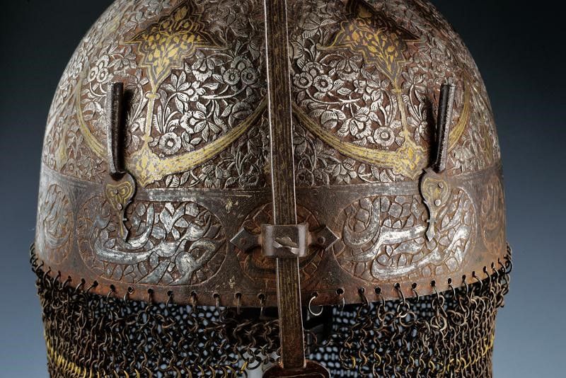 Impero Ottomano, altezza ca. 60 cm. XIX Secolo Elmo con coppo emisferico in ferro sormontato da cuspide posta su base troncoconica, nasale scorrevole in metallo decorato con un volto in oro nel cartiglio inferiore e con decorazione a motivi floreali in quello superiore. Due pennacchiere ai fianchi. Tutta la superficie del coppo con finissime incisioni floreali e con sei cartigli decorati in oro, il margine con iscrizioni in caratteri arabi. Bel camaglio a frange (piccole mancanze) formato da piccoli anelli a chiusura semplice, decorazioni ad anelli in ottone. Scudo (del diametro di 52 cm) di forma circolare e convesso, con quattro borchie a fiore e bordo rinforzato con anello in ottone rivettato; la superficie esterna decorata en suite con l'elmo; la parte posteriore con quattro anelli per le maniglie (mancanti).