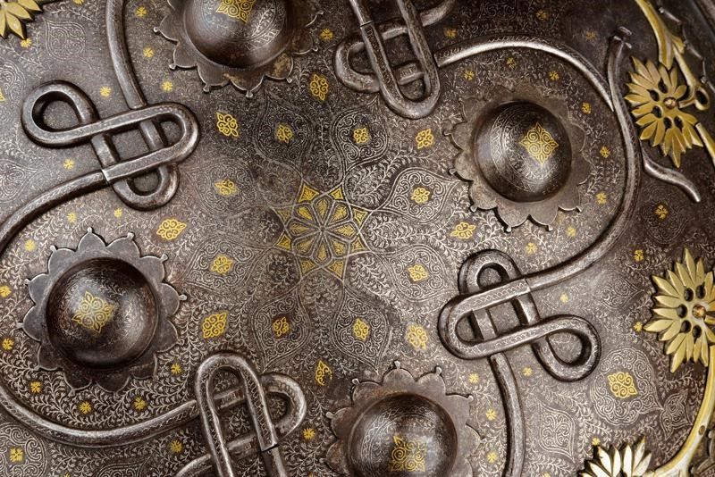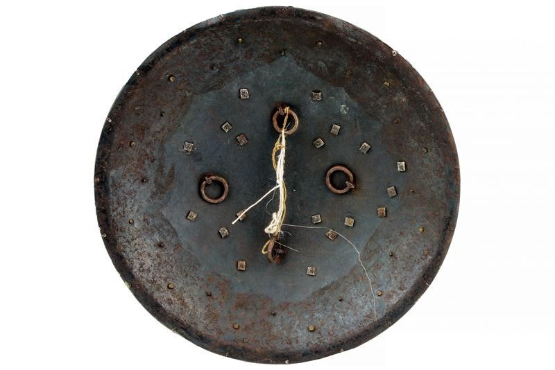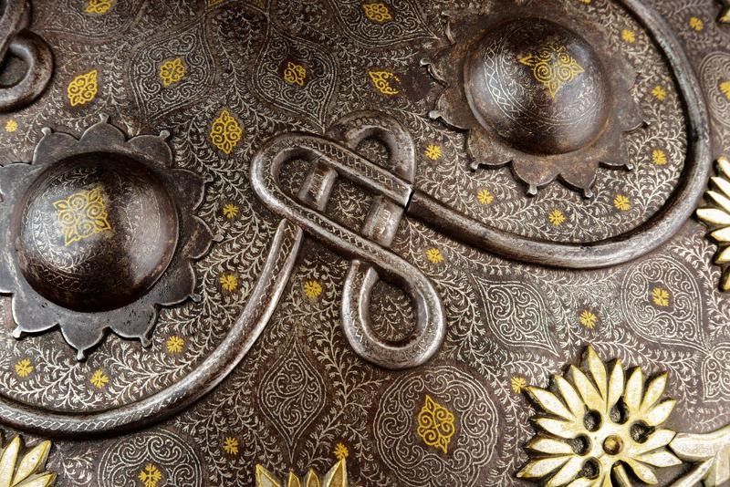 Indopersia, diametro 36 cm. Fine del XIX Secolo In ferro, di forma circolare e convesso, con quattro borchie munite di petali, bordo rinforzato e rivettato; tutta la superficie anteriore finemente ageminata in oro ed argento a motivi floreali e geometrici; il margine ornato con un giro di decorazioni rivettate in ottone; l'area centrale con cordoni in rilievo intrecciati a formare nodi. Sul retro quattro robusti anelli, maniglie mancanti.