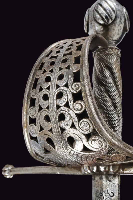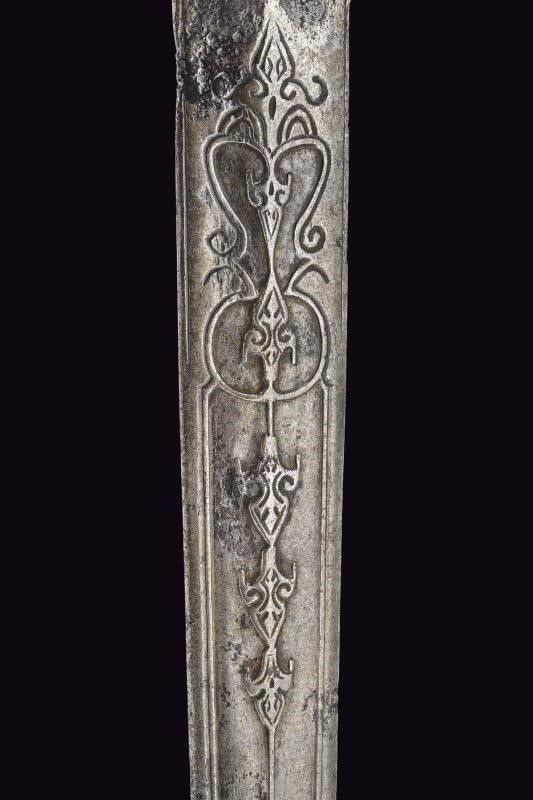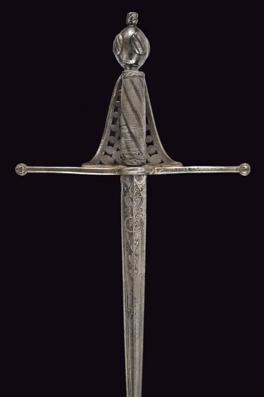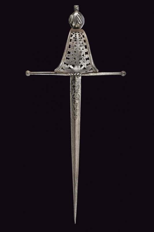 Italia, lunghezza 52.5 cm. XVIII Secolo Interessante lama di un pugnale turco con eleganti intagli e nervature. Fornimento in ferro con bracci dell'elso dritti, di sezione quadra e con testa a germoglio. Vela traforata ed incisa. Sul retro un piccolo anello di parata. Pomo ovoidale con quattro cartigli tondeggianti muniti di scanalature oblique. Impugnatura rivestita con trecciola e dotata di teste di moro in filo di ferro, probabilmente di epoca successiva.