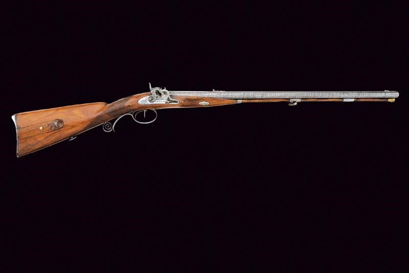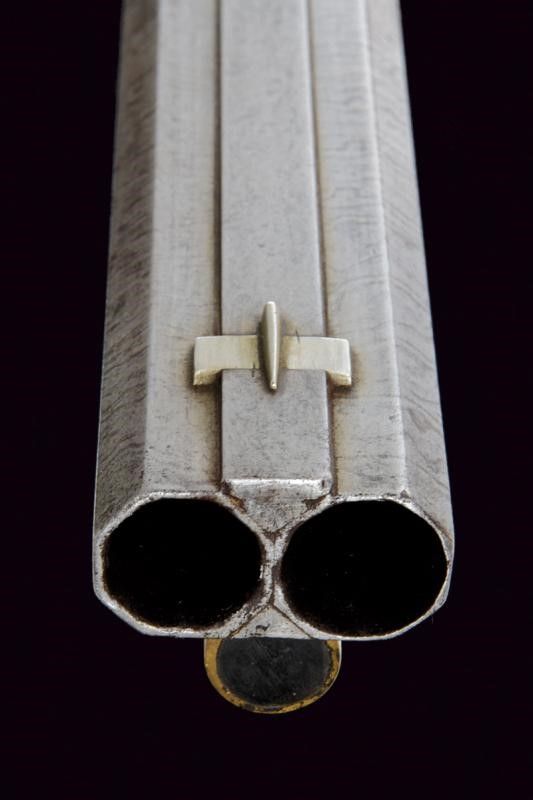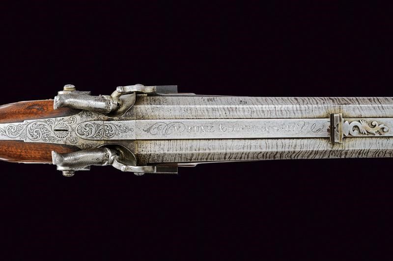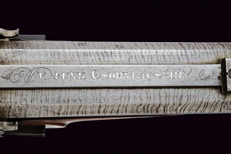 Metà del XIX Secolo Canne ottagonali, una con rigatura dritta, l'altra con rigatura elicoidale, entrambe con anima pulita e rigatura ben visibile, damascate, con bindella rialzata e piatta, marcata alla base 'V. FUNK & SÖHNE IN SUHL' in argento; l'alzo decorato, il mirino in argento; in volata cal 17 mm. Codetta incisa a volute. Batterie a molla in avanti, una marcata 'V. FUNK & SÖHNE', l'altra 'IN SUHL'; entrambe incise con raffigurazioni di animali nel bosco e disegni floreali; sicure esterne girevoli, dotate di molletta e rotellina, simili alle martelline delle armi a pietra. Mezza cassa in legno con collo zigrinato e poggiaguancia scolpito a fiorame. Patchbox. Fornimenti in ferro decorati en suite. Ponticello con ricciolo traforato. Bacchetta in legno con battipalla in ottone e con cavastracci. Uno dei grilletti con stecher.