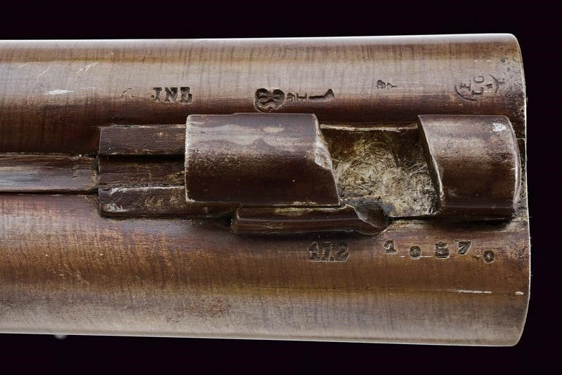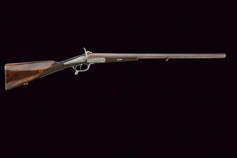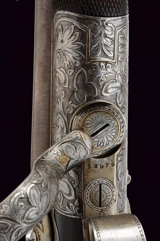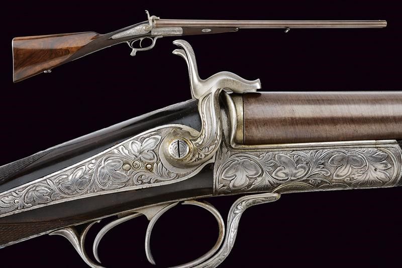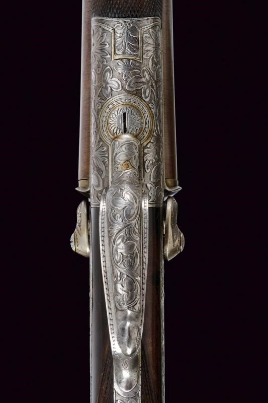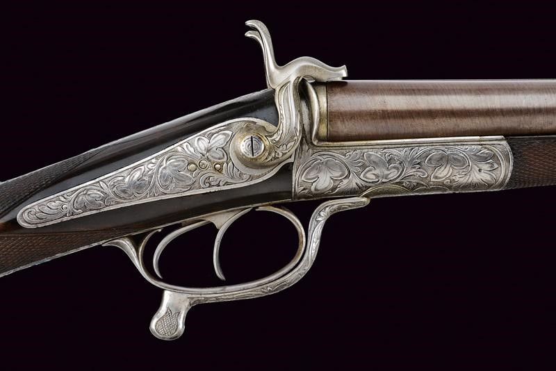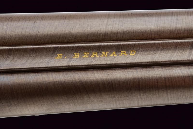 Francia, lunghezza 106.5 cm. 1870 circa Canne tonde, lisce (anime pulite, scarse le zone con leggero pitting), brunite, con bindella alta firmata 'E. BERNARD', mirino, cal. 17 mm; lunga codetta profondamente incisa a motivi floreali. Batterie a molla indietro decorate en suite come anche la bascula e tutti i fornimenti. Calcio ed astina in radica, entrambi con segmenti zigrinati. Leva d'apertura davanti al ponticello. Meccanica funzionante.