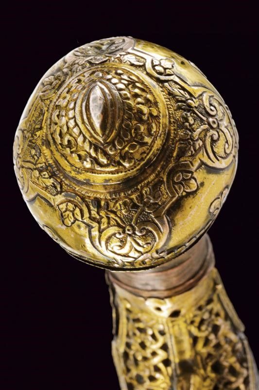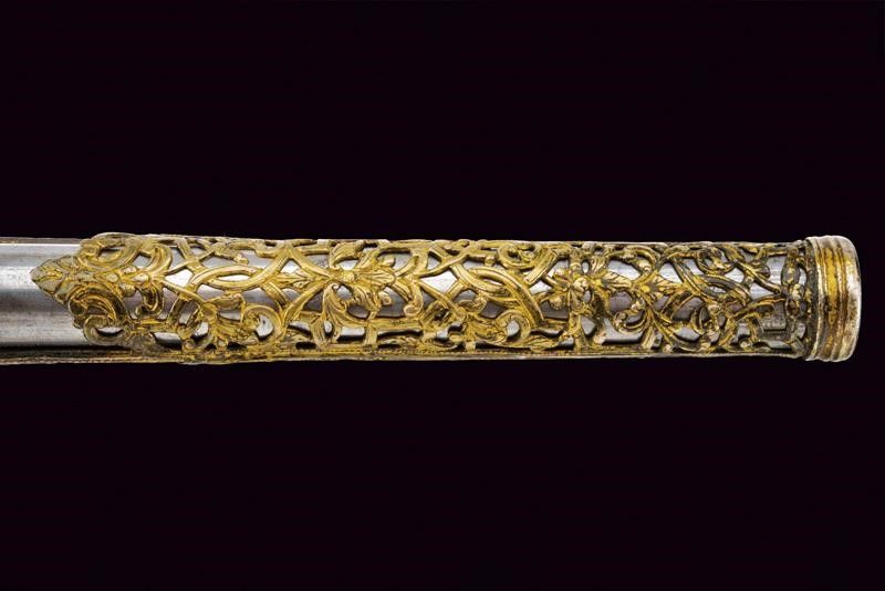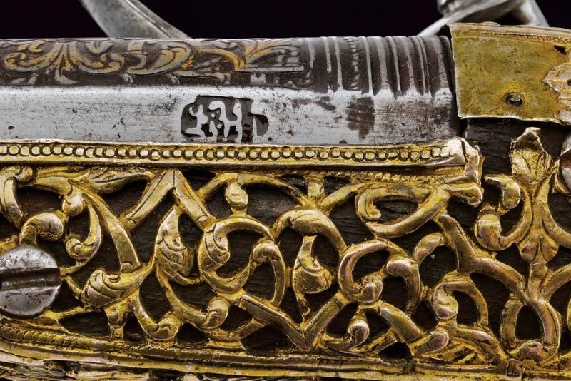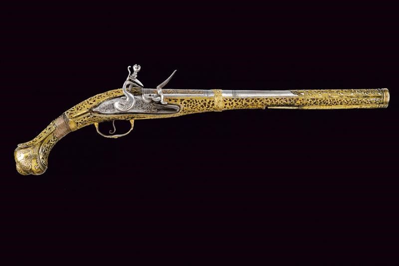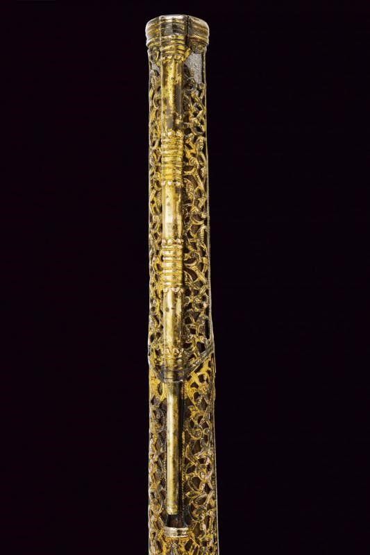 Turchia, lunghezza 52 cm. fine del XVIII Sec. Canna liscia a tre ordini, tutti di sezione tonda; la prima parte con fini incisioni floreali recanti resti di doratura incorniciate da anellature, sul lato sinistro un marchio ben visibile; gli altri due segmenti separati da anellature. Batteria a pietra focaia incisa en suite con la canna (priva di doratura). Cassa intera in legno completamente rivestita con fornimenti in argento dorato, riccamente traforati ed incisi a motivi floreali. Ponticello e pomo massicci e decorati in rilievo. Lungo reggicanna decorata en suite. Il collo con rivestimento in filo di rame. Piccoli difetti e mancanze.