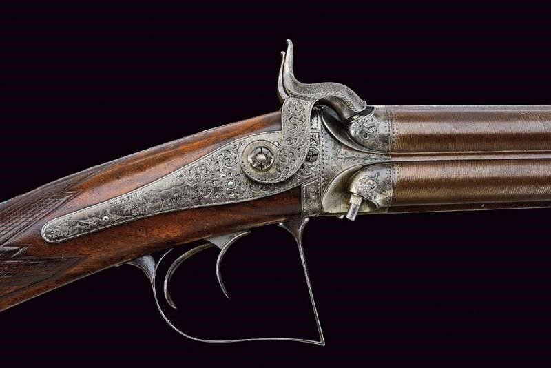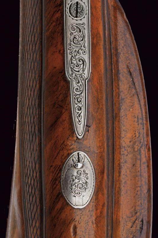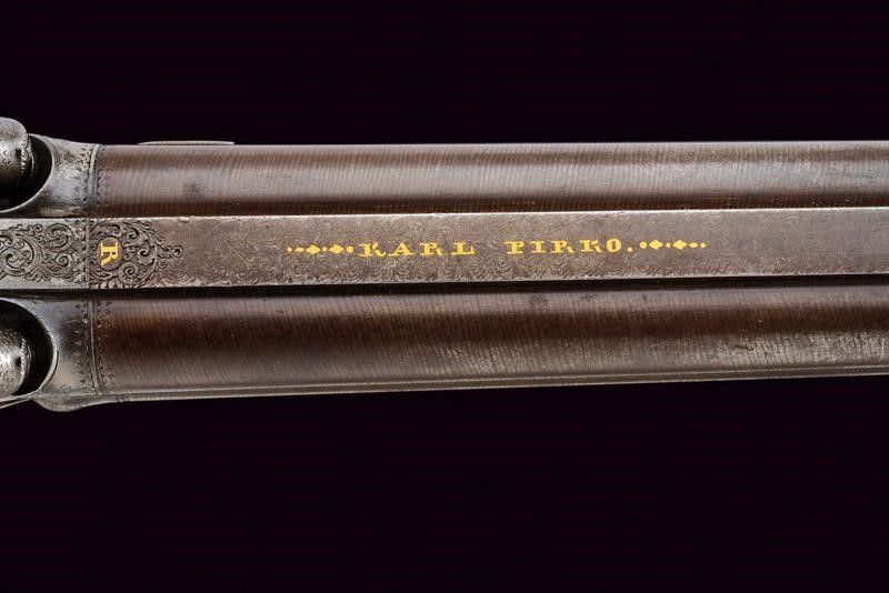 Metà del XIX Secolo Canne tonde lisce, ruotabili, damascate, brunite, munite di alte bindelle. Una delle bindelle firmata 'KARL PIRKO' in oro e incisa alla base con la lettera 'R' sempre in oro; un'altra marcata 'IN WIEN', con la lettera 'L' alla base. I mirini in argento, le volate in cal. 15 mm. Alla base di una canna punzone del banco di prova di Liegi, in quella accanto il numero '59'. I blocchi di culatta e i supporti dei luminelli incisi a motivi floreali. Batterie a molla indietro, una firmata 'PIRKO', l'altra 'WIEN'; con finissime incisioni raffiguranti segugi, volatili e disegni floreali. Calcio in legno con collo zigrinato. Fornimenti in ferro decorati en suite. Il ponticello brunito, premendone il segmento anteriore si sbloccano le canne, che possono così essere ruotate. Nella parte inferiore del calcio un piccolo serbatoio che contiene il cavastracci, che può essere avvitato alla bacchetta; questa è in ferro, munita di battipalla in ottone e alloggiata fra due canne. Al dorso uno scudetto ellittico in argento.