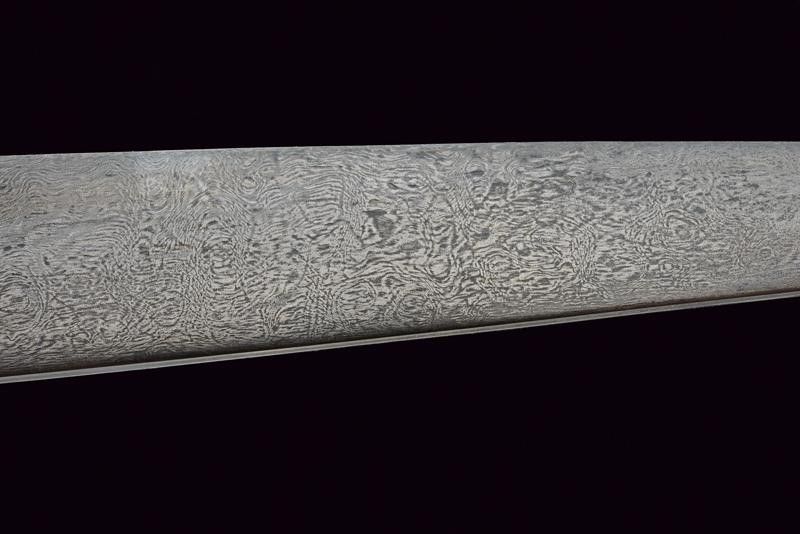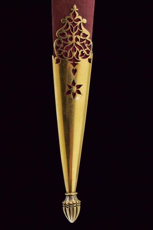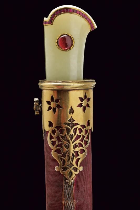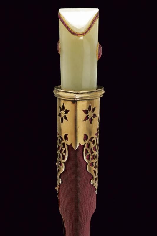 Indopersia, lunghezza 32.1 cm. Prima metà del XIX Secolo Lama dritta a un filo in finissimo damasco Wootz, lavorata in un solo pezzo con il tallone, decorato in oro a motivi floreali. Impugnatura in giada color verde pallido, con pomo a becco stilizzato e decorato con una fila di rubini sul bordo, al centro un occhio a cabochon, tutti incorniciati in oro (tecnica kundan). Fodero in legno rivestito con velluto rosso (completamente liso a parte le zone sotto ai fornimenti) con banda in canutiglia. Eleganti fornimenti in vermeil, deliziosamente traforati a motivi floreali. Anello di sospensione.