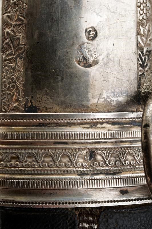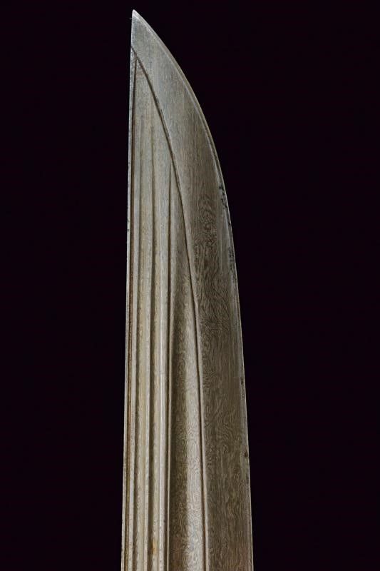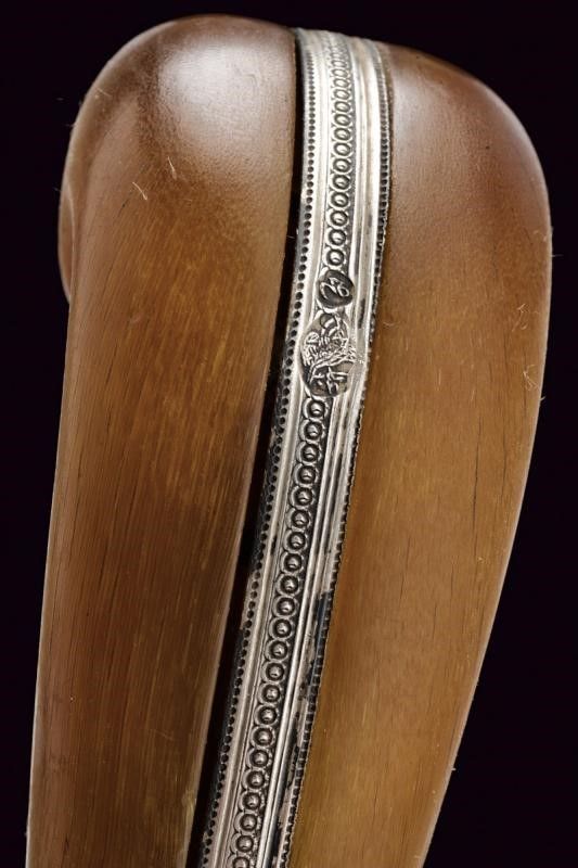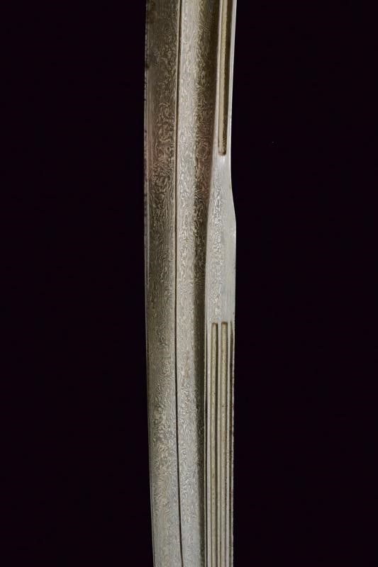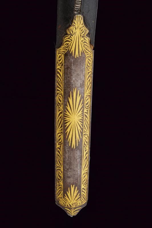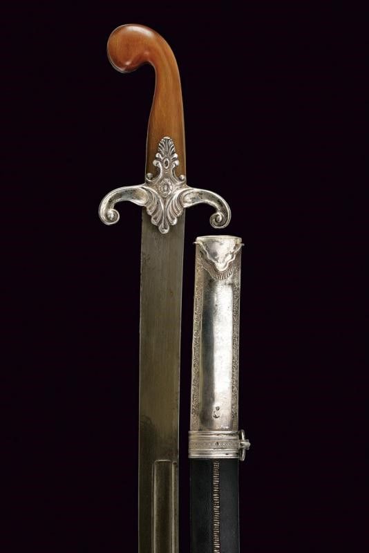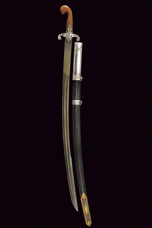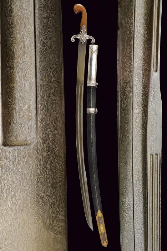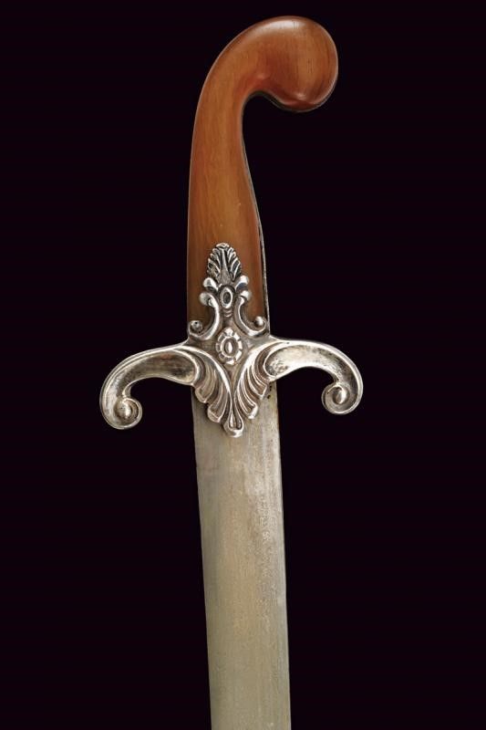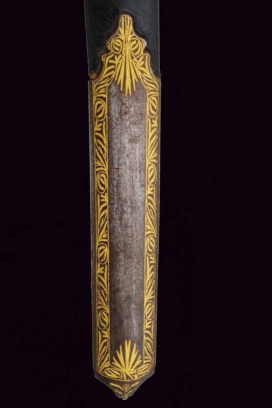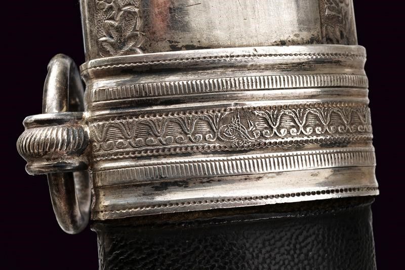 Impero Ottomano, lunghezza 98.5 cm. Seconda metà del XIX Secolo Eccellente lama poco incurvata, a un filo e controfilo, lievemente ingrossata al debole, in finissimo damasco, con base liscia seguita da una larga sgusciatura e una scanalatura al dorso che si sdoppia nella parte finale. Fornimento in argento sbalzato, guancette in corno e pomo controcurvato rispetto alla lama. Fodero in legno rivestito di cuoio cucito in filo metallico, la cappa e le due fasce in argento, incise a motivi floreali e geometrici; la cappa dotata inoltre di un anello sul lato posteriore e munita di due punzoni arabi; il puntale ageminato in oro decorato a motivi geometrici.