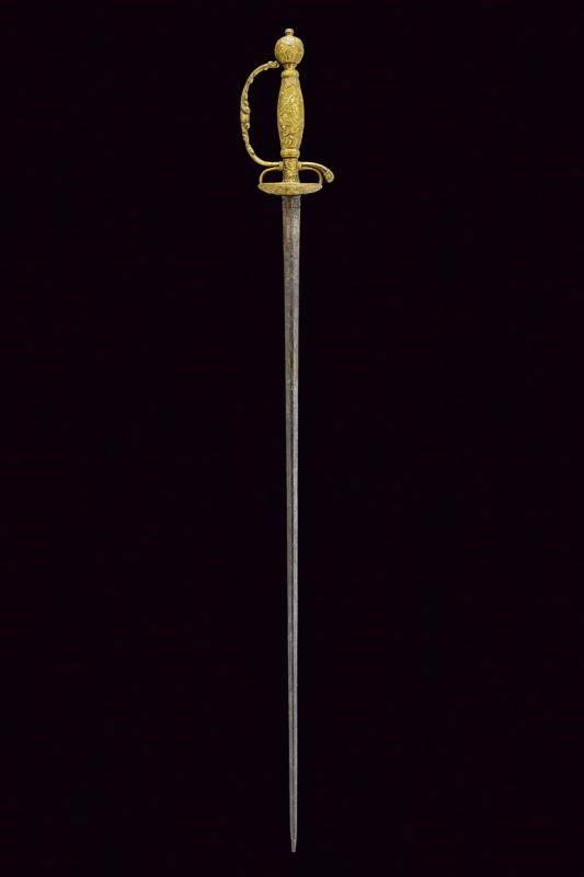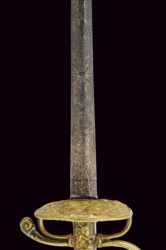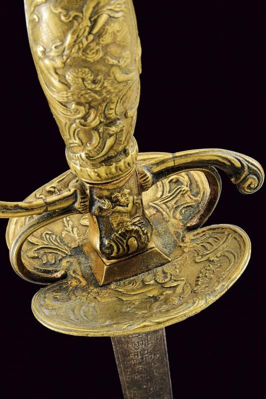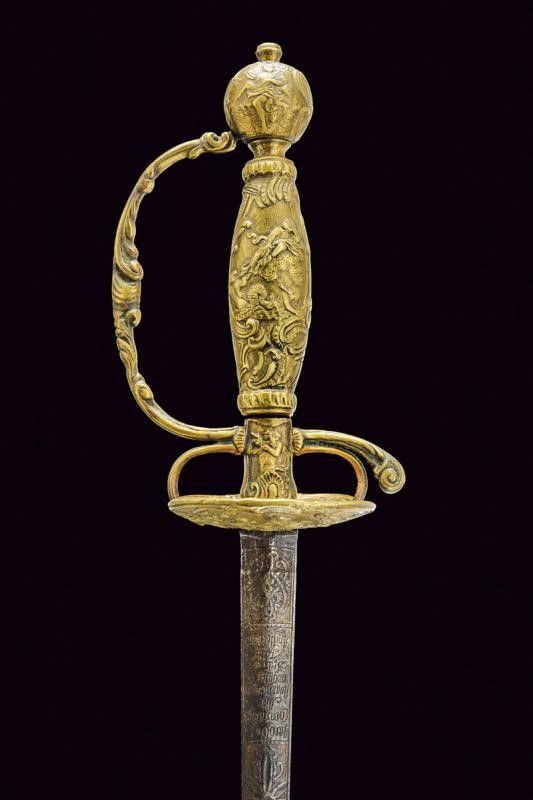 Amsterdam, lunghezza 85 cm. fine del XVIII Sec. Lama dritta a due fili di sezione esagonale, con iscrizione dello spadaio 'JACOBUS CORNRAADTS AMSTERDAM' al forte, e con incisioni effigianti un sole, volute, decorazioni geometriche e floreali; resti di doratura. Fornimento in ottone massiccio finemente decorato con personaggi e animali mitologici in bassorilievo.