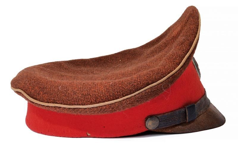 1914-18 In panno color ruggine con fascia rossa e visiera in pelle. Sulla fronte medaglione con leone fra colori della Bulgaria. Completo di alluda e cuffia.