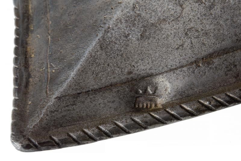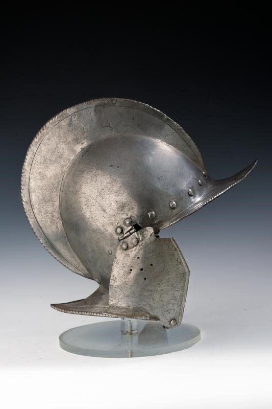 Italia, altezza 32 cm. Seconda metà del XVI secolo Coppo lavorato in un sol pezzo, con cresta di forma tondeggiante, ben rilevata a bordo lavorato a fingere il tortiglione e con delineature. La tesa aguzza e slanciata lievemente incurvata verso l'alto, con sottile margine a lista ribassata e cordone lavorato a fingere il tortiglione. Resti di una marca accanto al cordone stesso. La gronda lavorata en suite. I guanciali probabilmente di sostituzione antica. All'interno tracce di vecchi coietti sotto ai ribattini. Bel profilo slanciato.