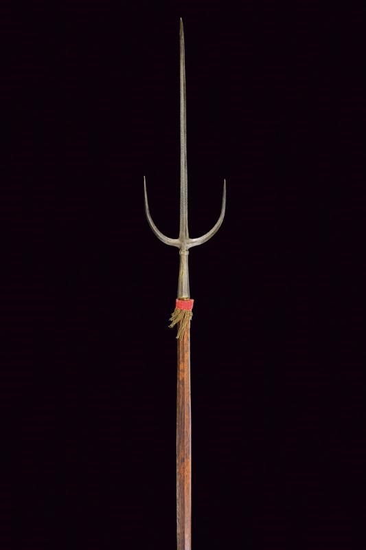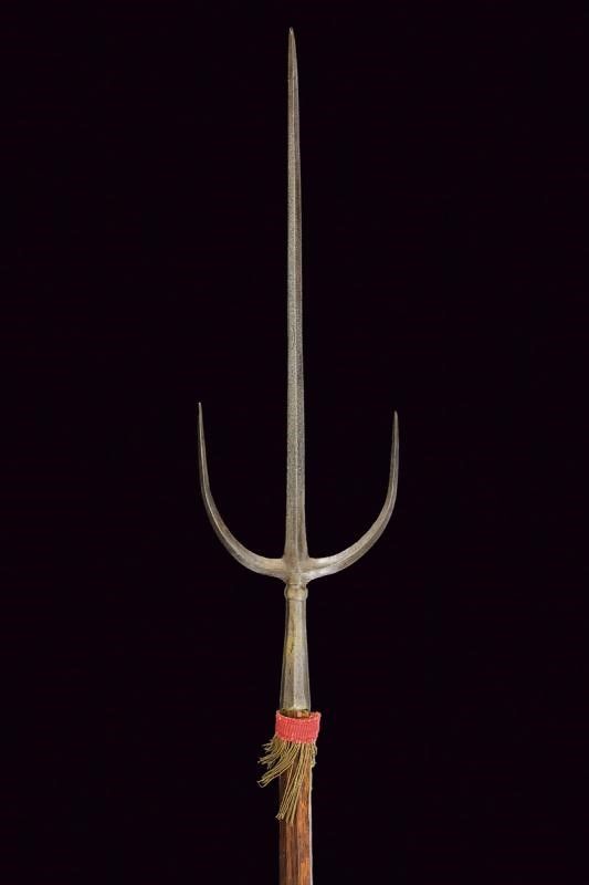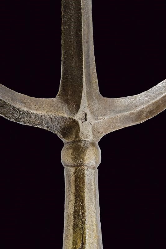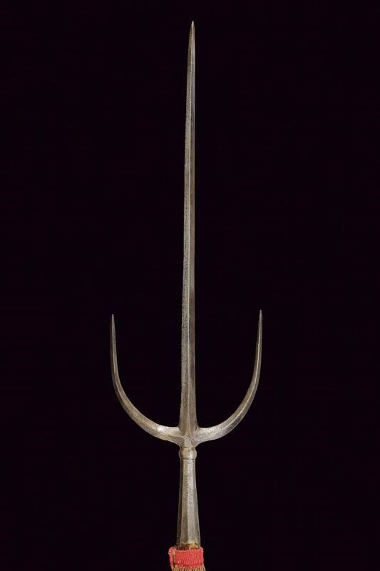 Italia settentrionale, lunghezza 240 cm. XVII Secolo In ferro, con cuspide di sezione a losanga munita alla base di due ali incurvate verso l'alto. Nodo e gorbia troncoconica faccettata. Con resti di bandelle piatte, su asta lignea di sezione ottagonale, nappa di epoca moderna.
