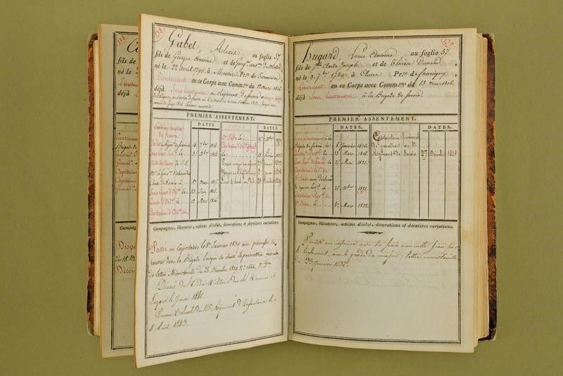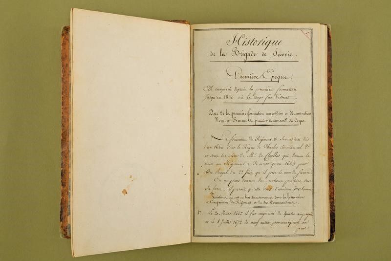 Francia, altezza 19 cm. XVIII/XIX Secolo Interessante volume contenete i registri scritti a penna del reggimento de Savoie 'Historique de la Brigade de Savoie'. Numerose pagine contenenti nomi e storia militare degli ufficiali e sottufficiali del reggimento. Copertina rigida in pelle, il dorso con 'BRIGADE DE SAVOIE / MATRICULE DES OFFICIERS ET HISTORIQUE'.