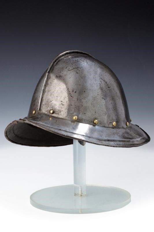 Inghilterra, altezza 20 cm. 1640 circa Coppo in ferro lavorato in due metà con tesa spiovente a bordo ribassato e orlato; la sommità con piccola cresta, la base della calotta con giro di rivetti in ottone; sul lato posteriore una pennacchiera. All'interno resti dei coietti per il fissaggio della fodera. Piccoli danni e mancanze.