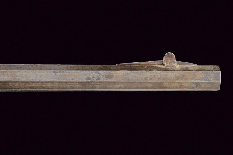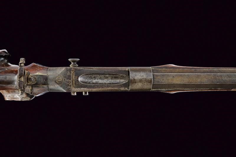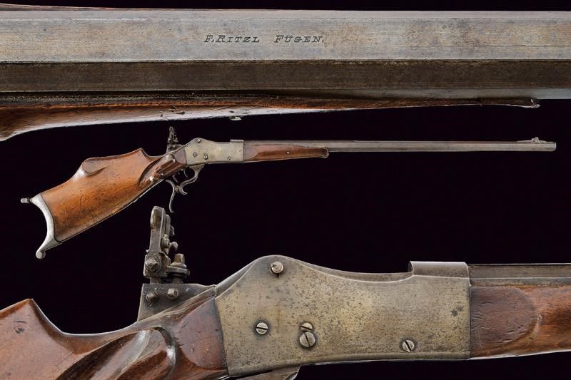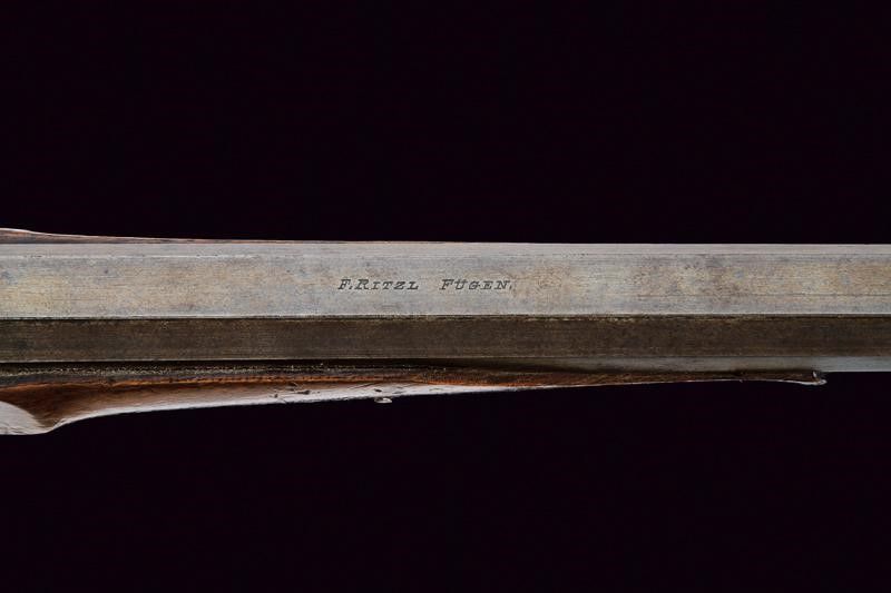 Austria, lunghezza 126 cm. 1870 circa Pesante canna ottagonale, rigata (anima con leggero pitting, rigatura visibile); il segmento iniziale con bindella firmata 'F. RITZL FÜGEN'; in volata il mirino, cal. 8 mm. Castello liscio con tipico otturatore a blocco basculante; meccanica funzionate. Calcio ed astina in legno (piccole mancanze, segni d'uso e del tempo); la codetta con diottra. Fornimenti in ferro, ponticello con poggiadito; stecher funzionante. In patina, da pulire.