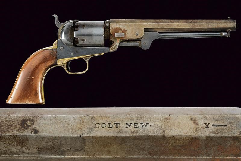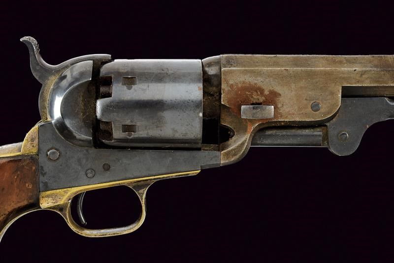 USA, lunghezza 34 cm. 1856 Canna ottagonale rigata con resti di marcatura dorsale '... COLT NEW ... Y' in una riga, Cal. 36. Rigatura visibile, anima da pulire. Tamburo a sei colpi recante ancora visibile la scena della battaglia navale, leggibile solo la marcatura 'COLT'S PATENT' e il numero di serie. Meccanica funzionante. Il castello con marcatura 'COLT'S PATENT sul fianco sinistro. Bande dell'impugnatura in ottone con resti di argentatura. Matricola '63xxx' coeva su canna, calcatoio (parziale), castello e bande dell'impugnatura. Tamburo con numerazione differente. Parziali ribruniture. Impugnatura liscia in noce.