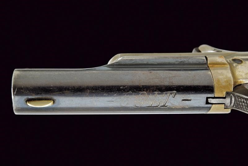 USA, lunghezza 11,8 cm. 1870 - 1889 circa Canna tonda, rigata (rigatura visibile, un po' di pitting all'interno), marcatura dorsale 'COLT'. Cal. 41 rimfire. Castello in bronzo. Meccanica funzionante. Conserva buona parte della brunitura color blu antica alla canna e della finitura nichelata al castello. Impugnatura con guancette in noce.