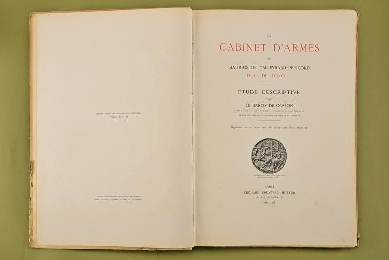 1901 'Le Cabinet D'Armes de Maurice de Talleyrand-Perigord Duc de Dino', Edouard Rouveyre Editeur, Paris, 1901; esemplare 90; 119 pagine con 25 tavole. Copertina rigida, il dorso mancante. Generali piccoli difetti.