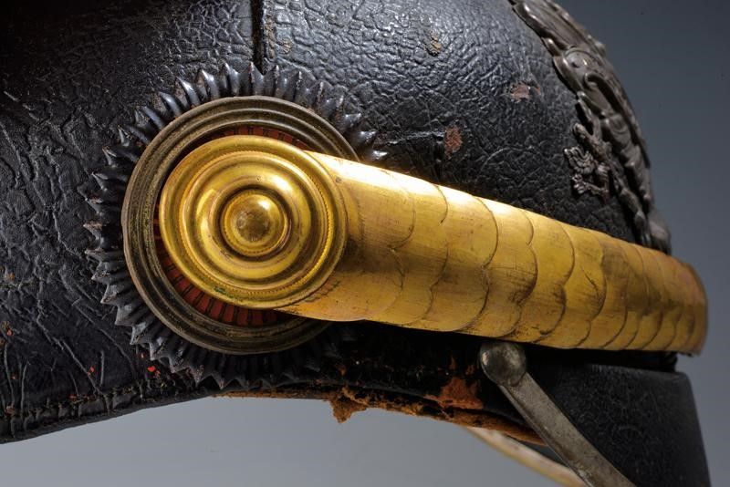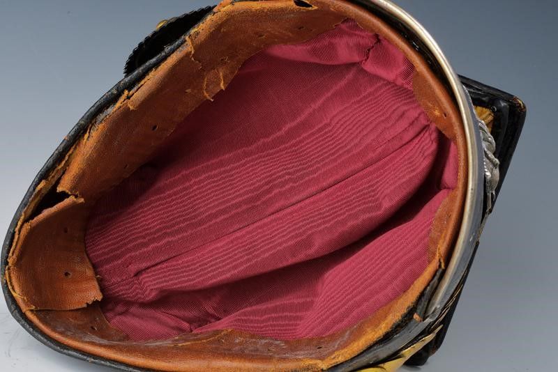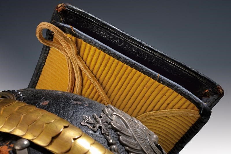 primo quarto del XX Sec. In cuoio, completa di aquila di linea color argento, soggolo color oro convesso, kuvert giallo. Alluda in pelle, fodera in seta rossa.