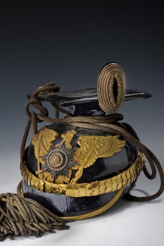 Prussia, altezza 16 cm. 1900 circa Corpo in cuoio laccato di nero, aquila dorata con stella dell'Aquila Nera in argento, parzialmente smaltata, soggoli convessi color oro, coccarda del reich e feldzeichen da ufficiale; completa del cordone in canutiglia argentata. All'interno marocchino in pelle marrone. Cuffia mancante. Molto raro.
