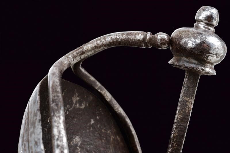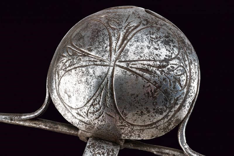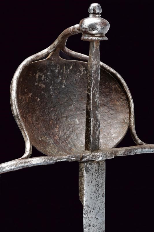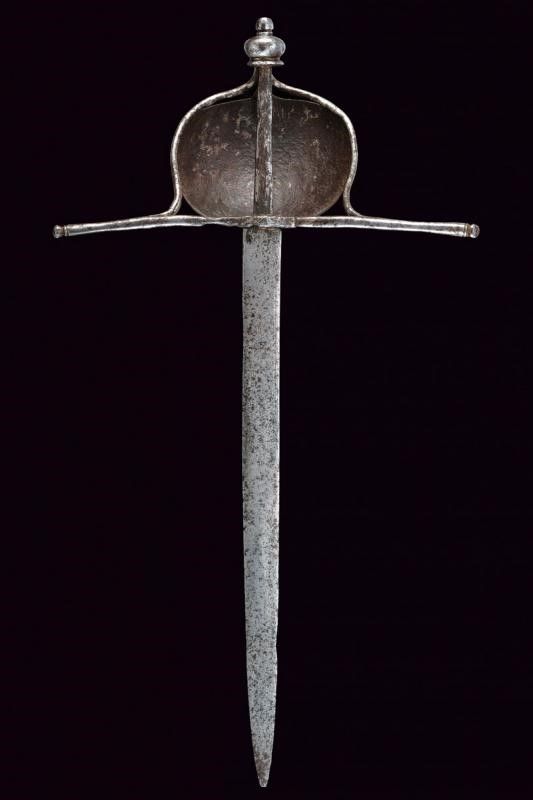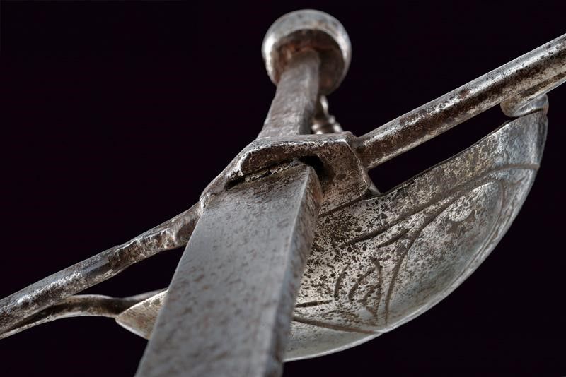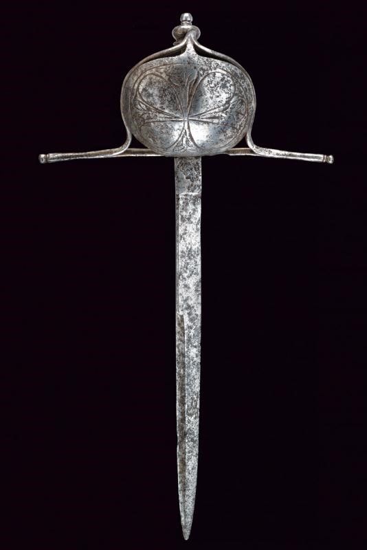 Spagna, lunghezza 41.5 cm. 1650 circa Lama dritta a un filo e controfilo (aree intaccate), piatta sul retro, con segmento alla base a dorso piatto e con resti di incisioni a motivi floreali; tallone con resti di marca. Fornimento in ferro con vela incisa a croce (probabilmente emblema di un ordine), bracci dell'elso dritti e dotati a metà di una ramificazione che si raccorda con la vela ed il pomo; quest'ultimo di forma sferoide schiacciata e munito di bottone. Codolo in ferro, privo di impugnatura.