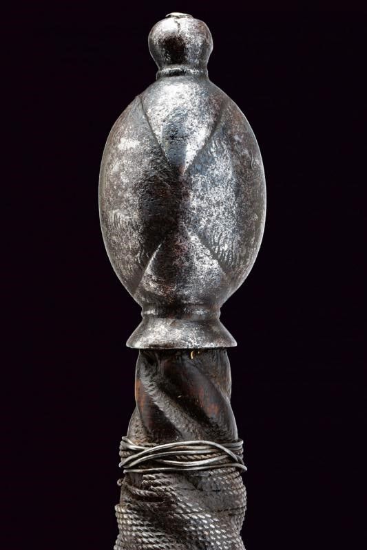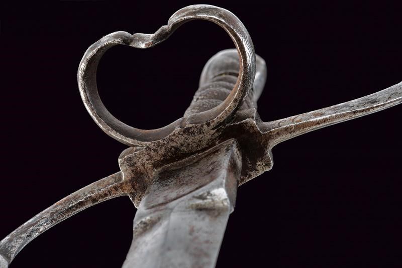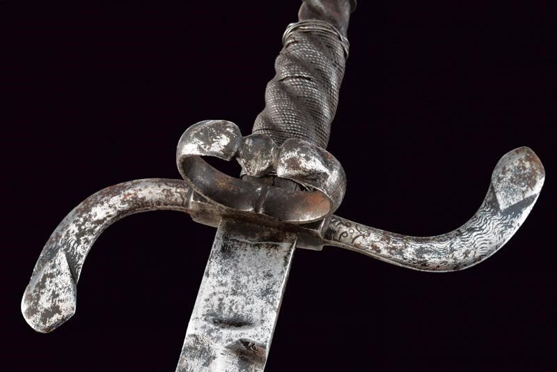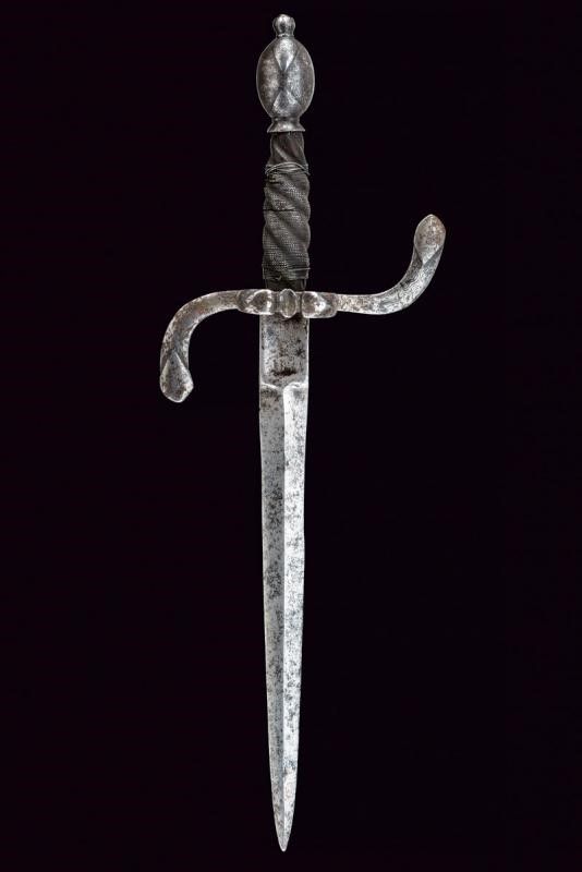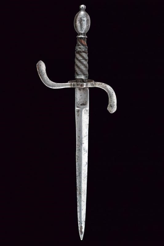 Sassonia, lunghezza 35.5 cm. 1590 circa Lama dritta a due fili, costolata in mezzeria; tallone di forma rettangolare leggermente sgusciato. Fornimento in ferro con bracci controcurvati a 'S', dotati di testa leggermente allargata ed ingrossata, la superficie con resti di incisioni ad emulare la pelliccia di un animale. Anello di parata leggermente schiacciato al centro e lavorato en suite con i bracci. Pomo ellittico inciso en suite e con bottone. Impugnatura in legno lavorata a spire, rivestita con trecciola metallica in filo di ferro (resti).