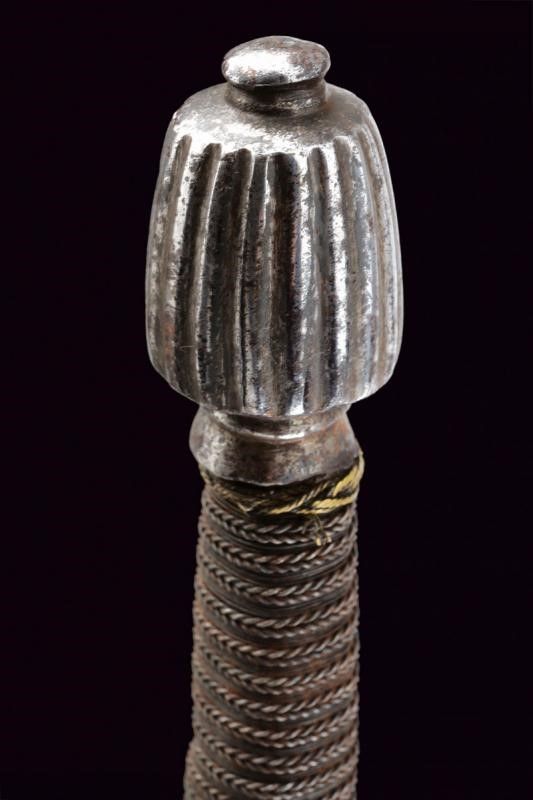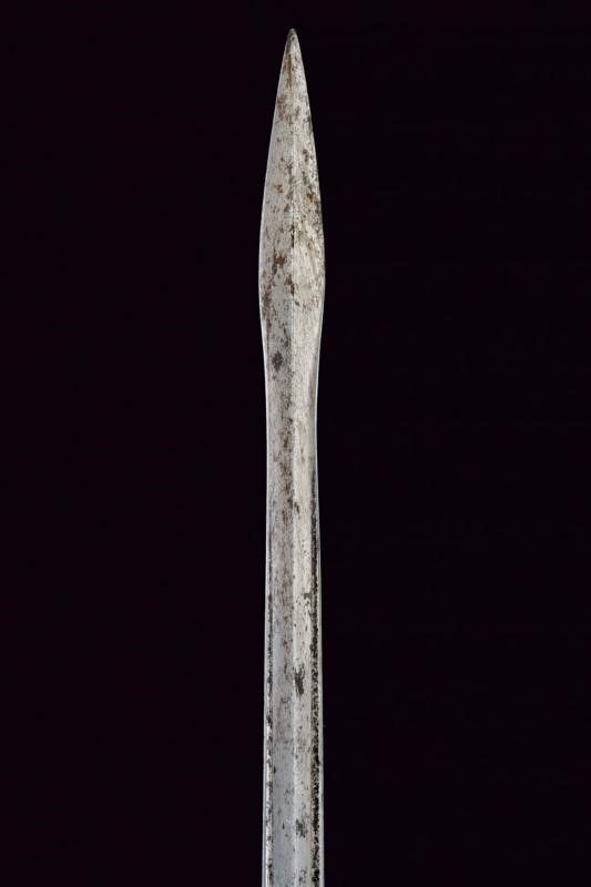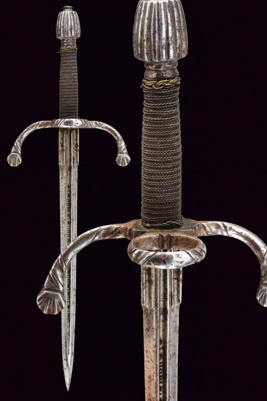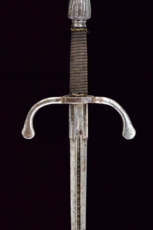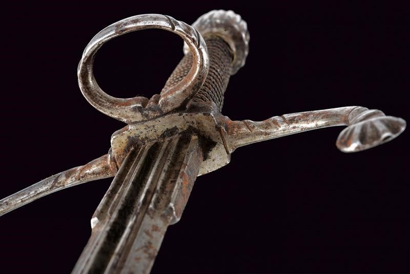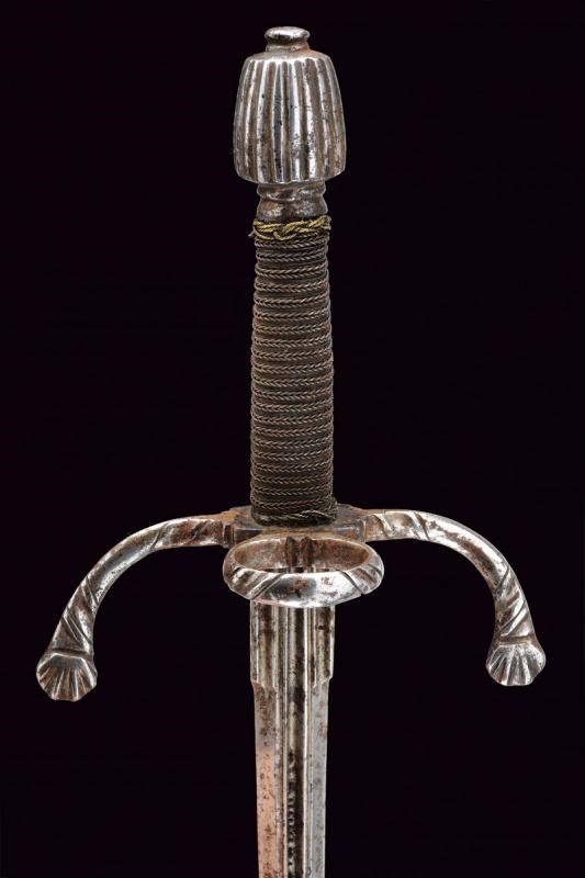 Germania, lunghezza 39 cm. 1600 circa Robusta lama dritta a due fili, fortemente scanalata e traforata al centro; il tallone con triplice scanalatura, la punta leggermente ingrossata e costolata in mezzeria. Fornimento in ferro con bracci incurvati verso la lama, intagliati a scanalature oblique e con palmette alle estremità; anello di parata decorato en suite. Pomo scanalato longitudinalmente. Impugnatura in legno rivestita da trecciola in filo di ferro e con teste di moro in filo d'ottone.