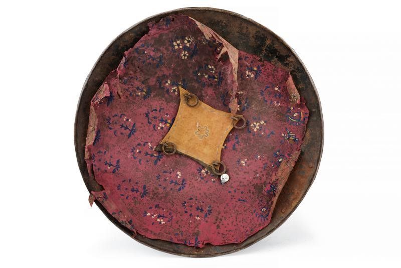 India, diametro 44 cm. XIX Secolo In ferro, di forma circolare e convesso, munito di quattro borchie con base traforata, bordo rinforzato e rivettato; tutta la superficie anteriore finemente incisa con animali quali elefanti, tigri e figure antropomorfe. Parzialmente decorato in oro. Il retro con resti della fodera in tessuto ricamato; al centro quattro anelli per le maniglie (mancanti).