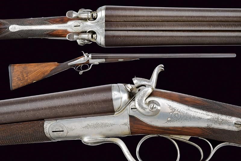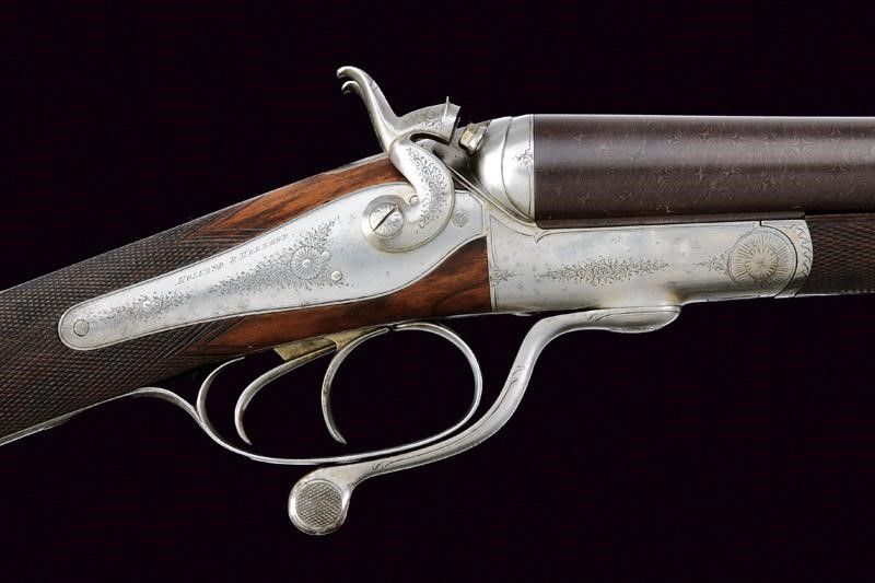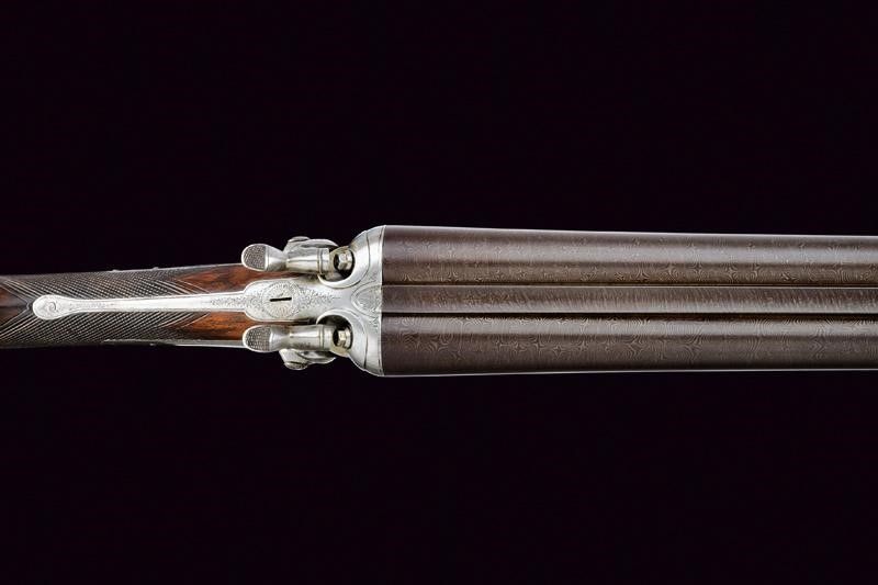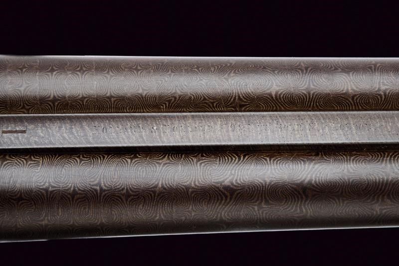 Londra, lunghezza 116.5 cm. 1875-1890 Canne tonde lisce (anima pulita, zone con pitting) in damasco brunito; la bindella con resti di marcatura H&H, e marcatura '1'; nella parte inferiore punzoni e numero '20884'; mirino, cal. 12. Codetta incisa a volute. Batterie a molla indietro marcate 'HOLLAND & HOLLAND' ed incise en suite. Chiave a rotazione davanti al ponticello. Meccanica da rivedere (i percussori non rientrano). Calcio ed astina in legno con zigrinature. Fornimenti in ferro decorati nello stesso modo. La coda del ponticello con matricola '44xx' e 'I'.