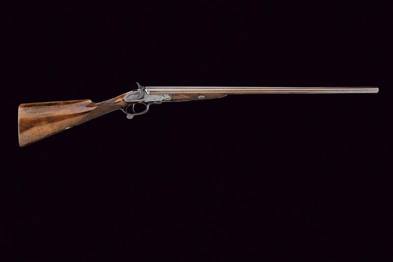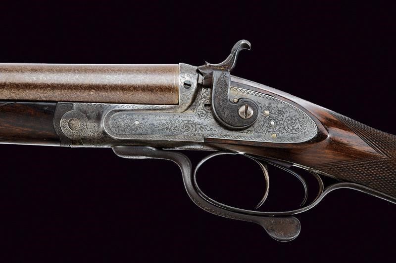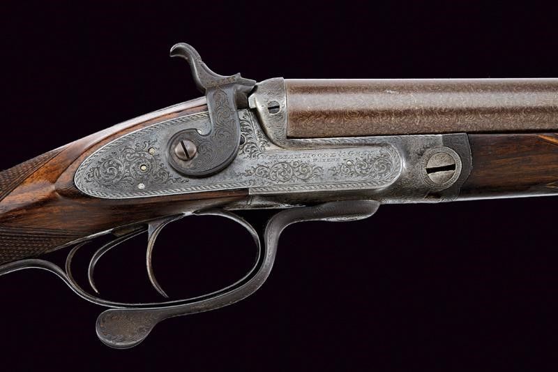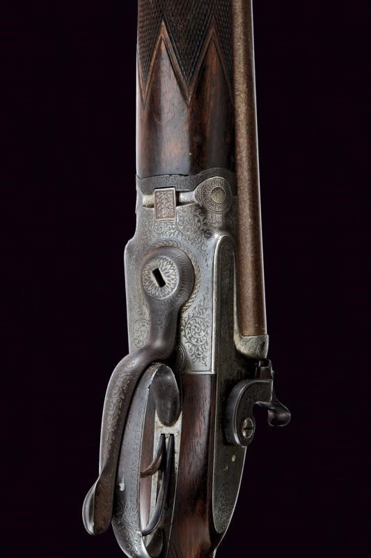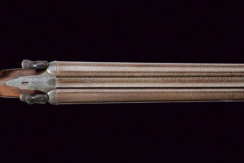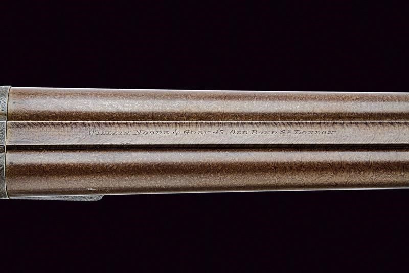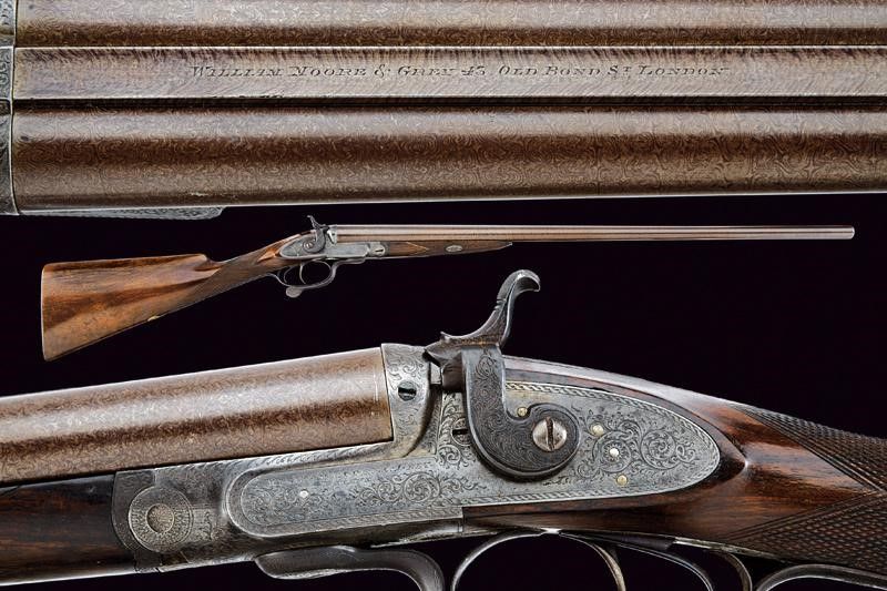 Londra, lunghezza 116,5 cm. 1880 - 1889 circa Canne tonde lisce (piccole zone con pitting, anime pulite), in damasco brunito, la bindella marcata 'WILLIAM MOORE & GREY 43. OLD BOND S.T LONDON'; mirino, cal. 18 mm. Codetta finemente incisa a volute. Batterie a molla in avanti firmate 'WILLIAM MOORE & GREY PATENT' ed incise en suite. Calcio ed astina in radica con zigrinature. Chiave con leva davanti al ponticello. Fornimenti in ferro decorati nello stesso modo. La coda del ponticello con matricola '23xx'.