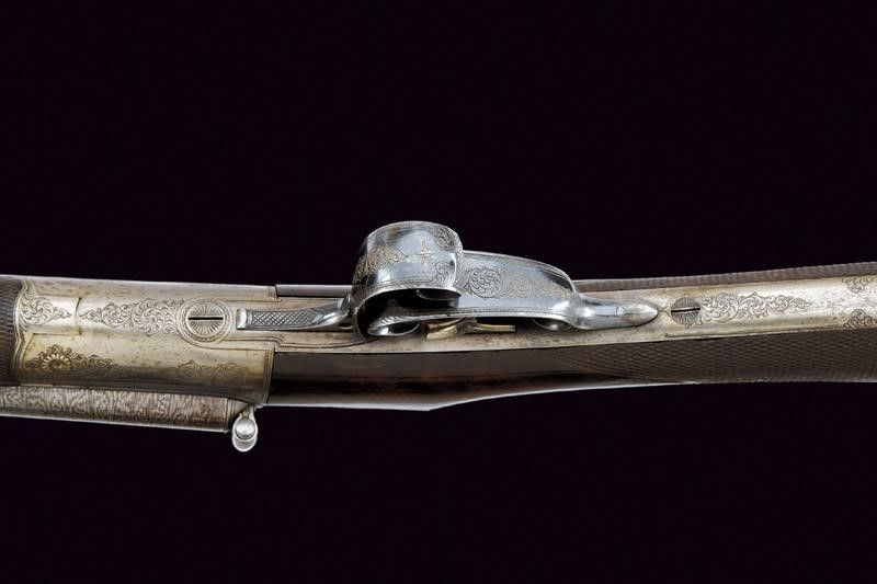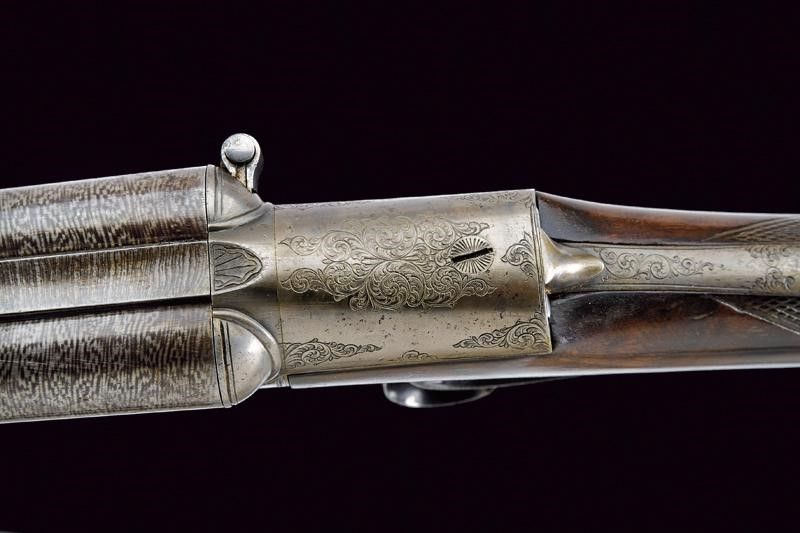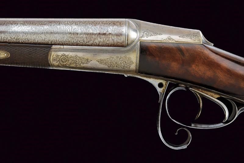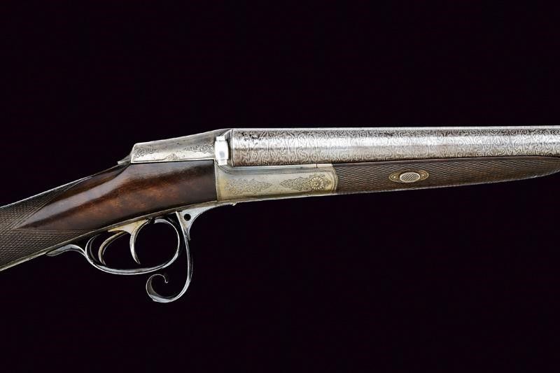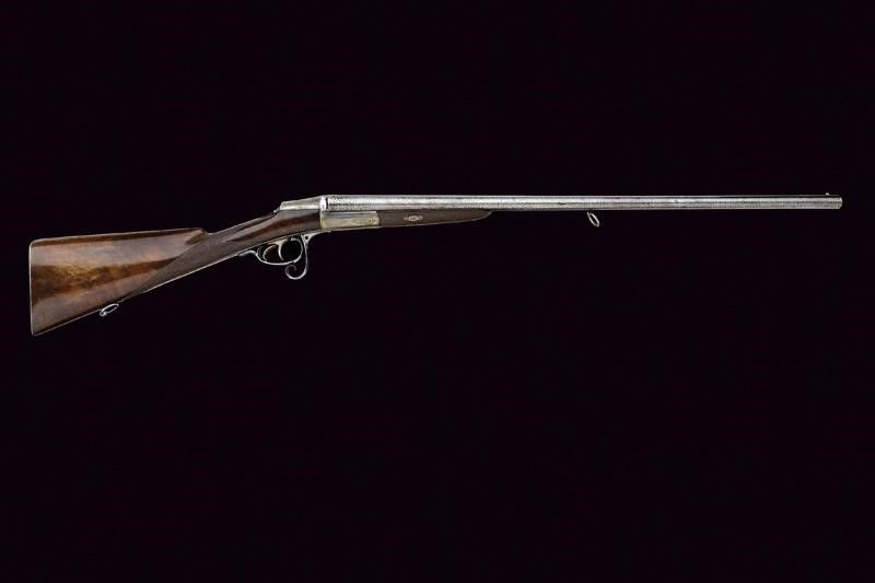 Belgio, lunghezza 111 cm. 1880 - 1889 circa Canne tonde lisce con bindella marcata 'VICTOR COLETTE', in calibro inferiore al 16 (16,5 mm. in volata). Anime ben conservate con minimi segni del tempo. Conserva buona parte della finitura in damasco. Punzoni del banco di Liegi. Bascula incisa a racemi, dotata di percussori incassati e con chiave a leva posta anteriormente al ponticello che funge anche d'armamento. Calcio ed astina in noce zigrinato. Fornimenti in ferro. Il ponticello con resti di finitura color blu. Meccanica funzionante.