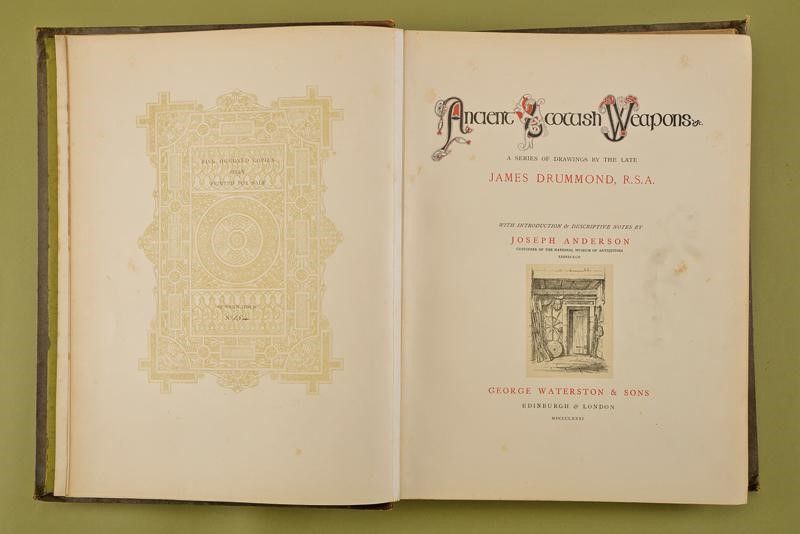 Inghilterra, altezza 41 cm. 1881 'Ancient Scottish Weapons'; George Waterson & Sons Edimburgh & London, 1881. Copia n. 154 di 500 esemplari in vendita. 26 pagine di introduzione, con testo in lingua inglese. 54 tavole con disegni a colori riproducenti armi, strumenti musicali e altri oggetti. Copertina rigida telata con dorso in pelle (difetti) recante un trofeo impresso e caratteri dorati. Pagine ingiallite. Raro.