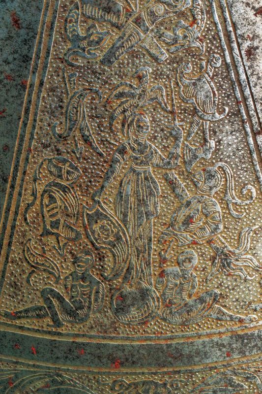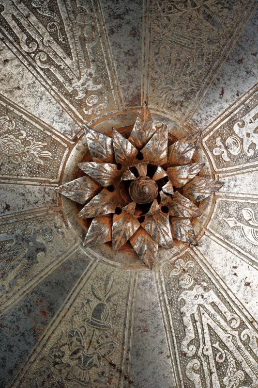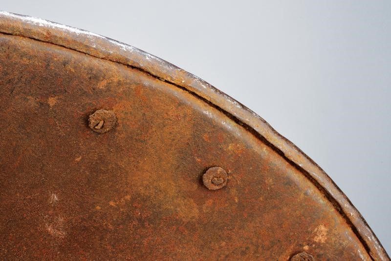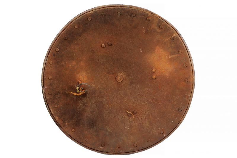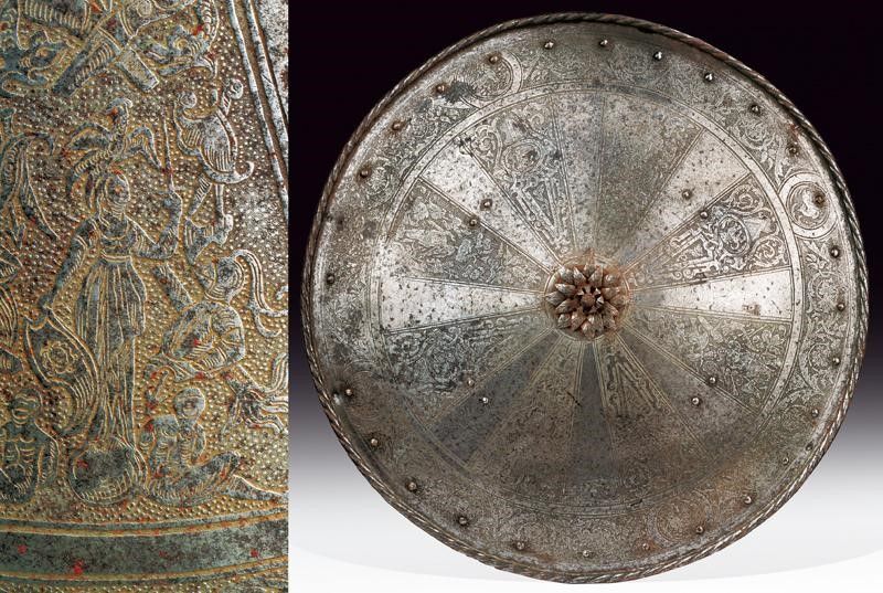 Italia del Nord, diametro 59 cm. Realizzato con un unica piastra in ferro, di forma circolare e leggermente convessa. Al centro il brocco (leggermente traballante) di sezione circolare e ornato con decoro tortile, poggiato su una base a triplice ghiera i cui strati sovrapposti, con elementi intagliati ed incisi, vanno a formare un un fiore. La superficie esterna dello scudo suddivisa in due elementi ben disitinti: il disco centrale e la banda esterna. Il primo, molto ampio è diviso in sedici spicchi, alternando quelli lisci a quelli incisi; questi ultimi presentano a loro volta temi decorativi alternati. Nel primo tema sono raffigurati uomini d'arme, trofei di armi e armature e figure allegoriche. Nel secondo tema decori architettonici che incorniciano animali araldici e quattro differenti scudi scudi italiani con emblemi araldici. La banda esterna presenta una cornice floreale e quattro tondi con effigi di animali. Tutte le incisioni su fondo a granuli. Il cordone esterno spesso e ben lavorato a fingere il tortiglione. Ribattini in ferro. Il retro in patina.