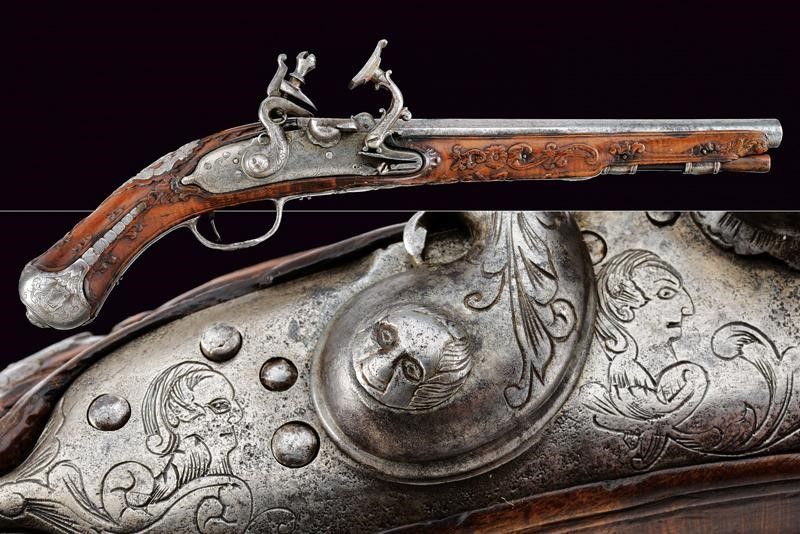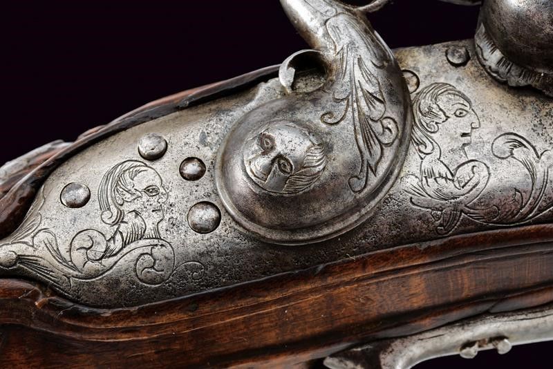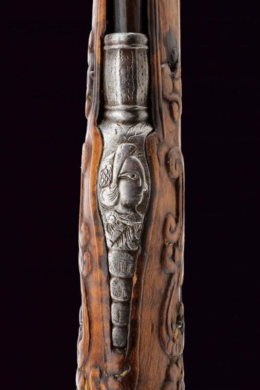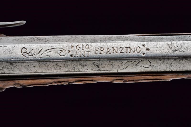 Italia settentrionale, lunghezza 38,3 cm. XVIII Secolo Canna liscia a due ordini, ottagonale e tonda. In culatta varie anellature, poi un fiorame inciso seguito dalla firma 'GIO ANT FRANZINO' fra asterischi, questa posta su una bindella dorsale che corre sino in volata, la quale ha calibro 12,4 mm. Batteria a pietra a cartella tondeggiante con incisioni a busti e racemi. Intaccature. Meccanica da rivedere. L'interno della cartella con firma 'G. Finelli'. Elegante cassa in legno riccamente intagliata a fiori e racemi. Fornimenti in ferro. Coccia, ponticello e contropiastra tutte con ritratti di profilo in rilievo. La contropiastra anche traforata e dotata di gancio da cintura. Bacchetta in legno con cavastracci in ferro.