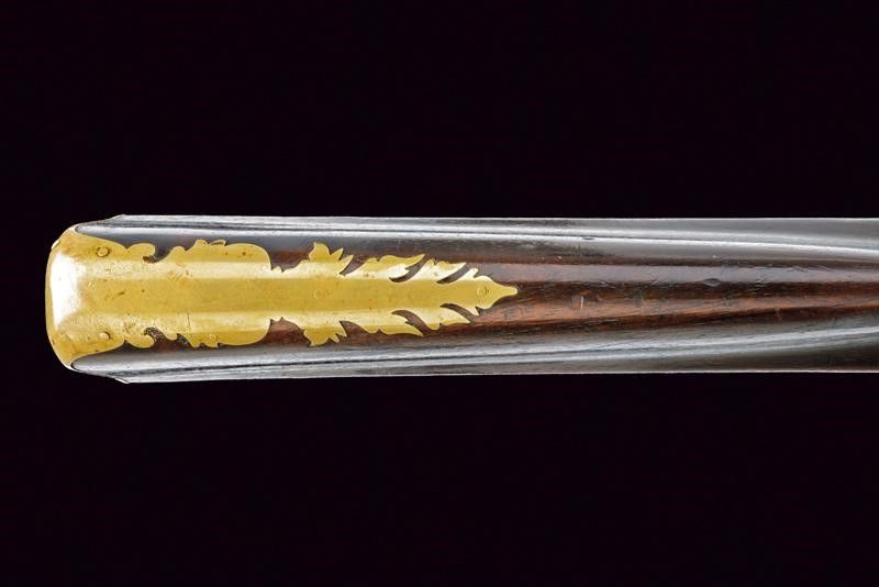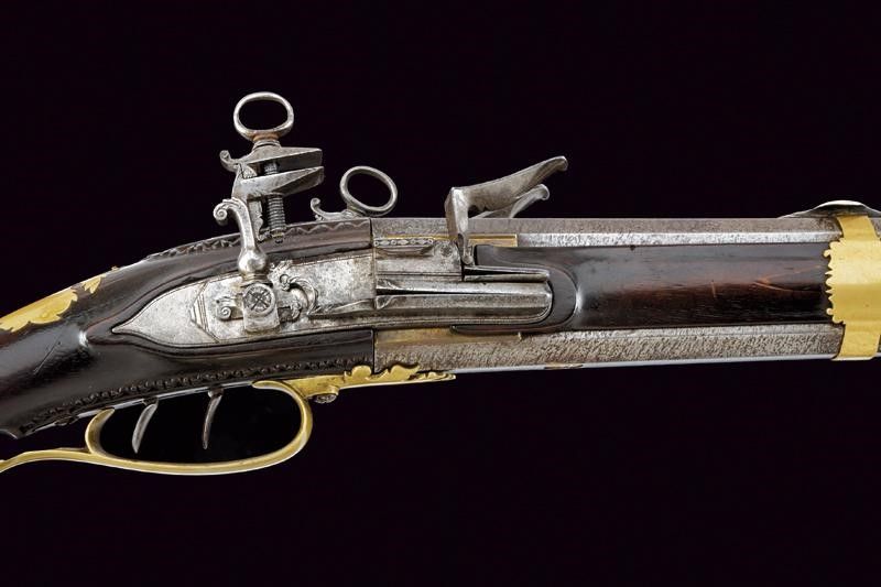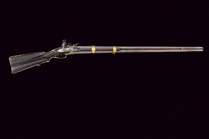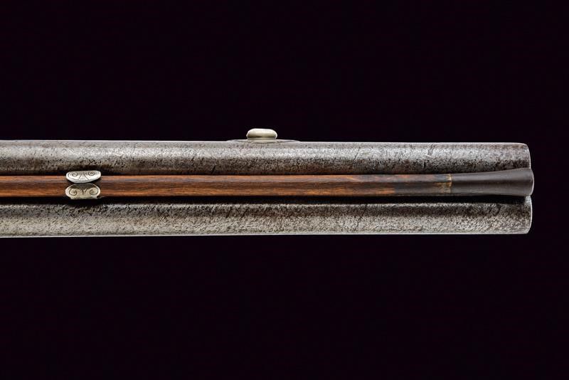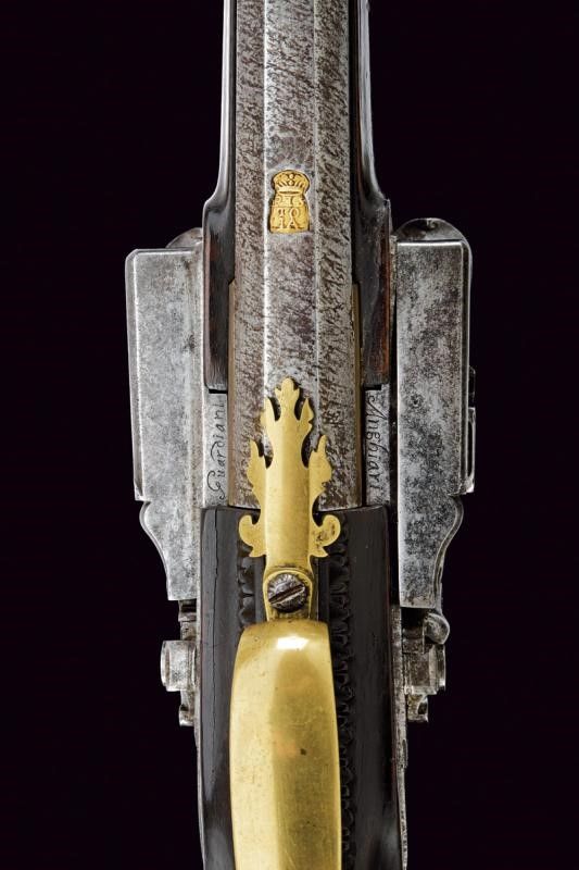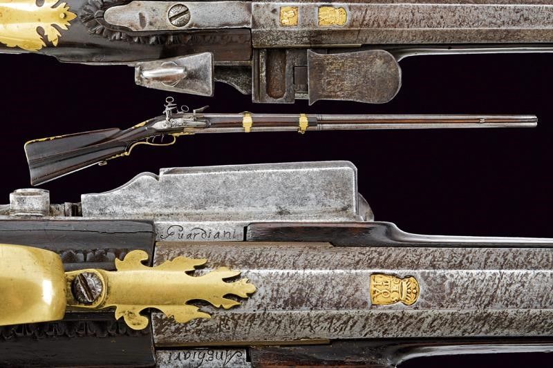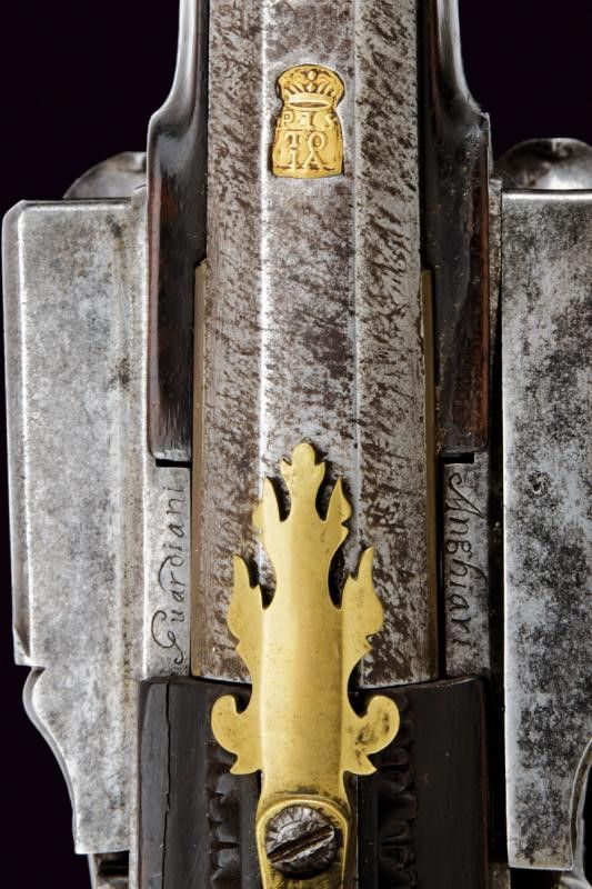 Anghiari, lunghezza 136,4 cm. 1816 Eleganti canne lisce a due ordini lavorate a torcione, entrambe ottagonli e tonde, con anellature al cambio e cal. 15,5 mm. in volata. Quella superiore con le marche rimesse in rame dorato: 'PISTOIA' coronata e una a leone. Mirino e alzo in argento. La canna inferiore con la sola marca 'PISTOIA' sempre dorata e coronata. Le snelle batterie con molle leggermente differenti per il diverso posizionamento delle canne. Con piccole incisioni floreali. Sul margine inferiore della cartella destra la firma 'Guardiani', sull'altra 'Anghiari'. Calcio ed astina in legno. Fornimenti lisci in ottone. Bacchetta in legno.