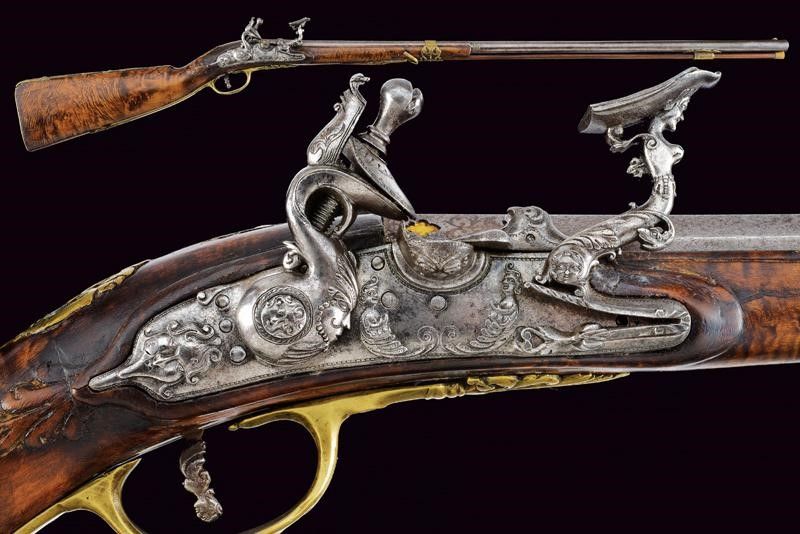 fine del XVII Sec. Canna liscia a due ordini ottagonale e tonda, molto ben conservata, recante in culatta punzoni dorati e tre agemine argentate a racemi. Al cambio una finissima cornicetta a foglie d'acanto su fondo dorato, il mirino argentato a coda di rondine, volata con corona, cal. 15,8 mm. Codolo con incisioni floreali. La batteria con cartella tondeggiante, ornata con tema a mascheroni, assai finemente realizzati: il cane con elegante profilo in rilievo sul collo e testa della vite a mascherone, figure grottesche sulla cartella. La codetta con altro mascherone ben rilevato. Il collo della martellina ancora a grottesche con intagli e trafori. Intagliato anche il lato inferiore dello scodellino. Firma 'Sabione' all'interno. Mezza cassa in bella radica marezzata (lievi tasselli rimpiazzati), con alcuni intagli. Fornimenti in ottone. Il calciolo con lunga coda dorsale recante vari ritratti in rilievo, di profilo. Anche ponticello e contropiastra, tutti con profili e ritratti. Bacchetta in legno con battipalla in corno e cavastracci in ferro.