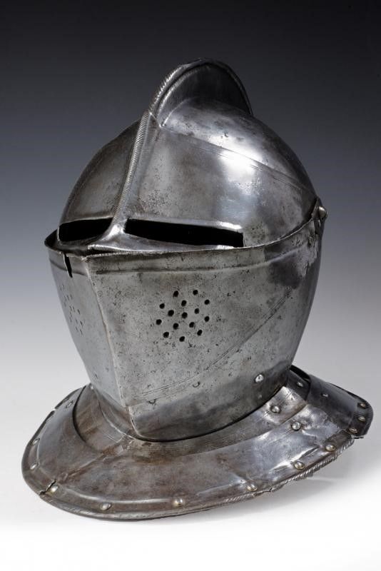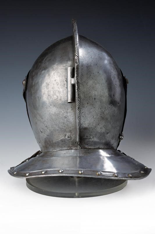 Olanda, altezza 28 cm. 1600 circa Coppo in ferro lavorato in due pezzi con bassa cresta lavorata a fingere il tortiglione. Visiera appuntita, costolata e lavorata, come la cresta, a fingere il tortiglione, due fessure oculari rettangolari. Ventaglia costolata e con rosetta traforata su entrambi i lati. Barbozza liscia dotata del gancio di chiusura. Due lame di guardacollo e due di gronda; quelle più esterne probabilmente di epoca leggermente più tarda, aventi margini ribassati e bordi lavorati a fingere il tortiglione; con coietti moderni. Restauri, piccoli difetti e mancanze. La parte posteriore con pennacchiera.