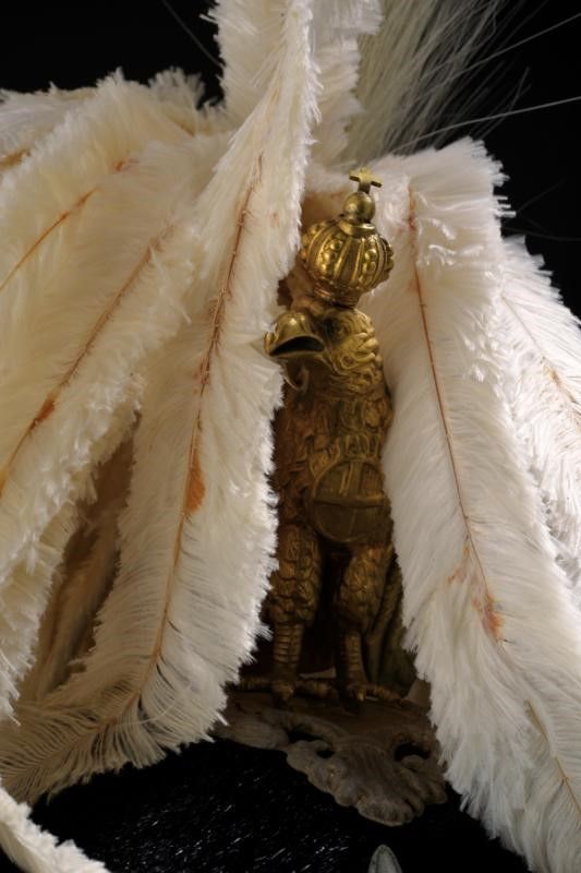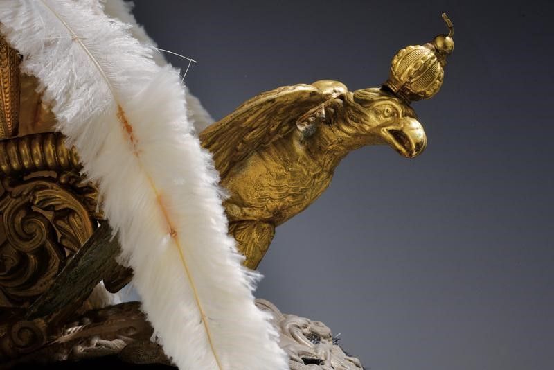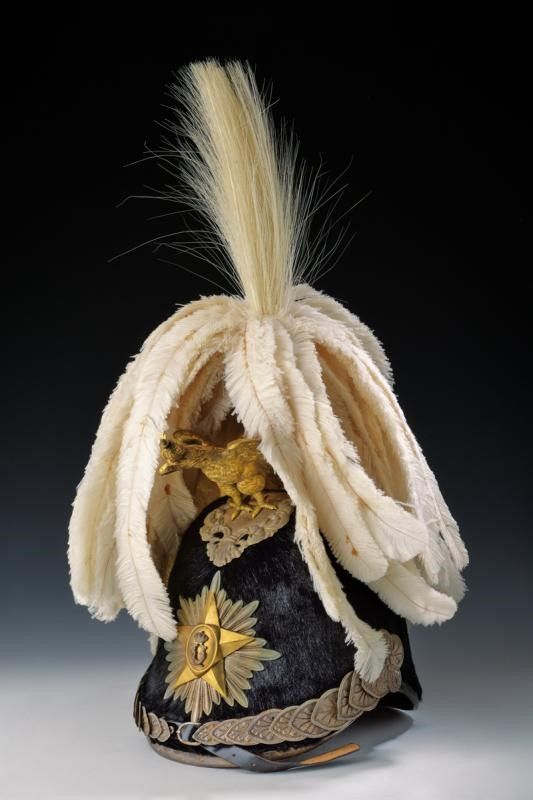 Italia, altezza senza pennacchio 28 cm. Seconda metà del XX Secolo Coppo in feltro rivestito di pelliccia di foca, cimiero in ottone messo a giorno e dorato come pure l'aquila a tutto tondo, caricata sul petto da croce; raggiera in metallo argentato come pure la base del cimiero e i tipici soggoli a squame. Stellone in metallo dorato recante il monogramma del re Umberto I. Interno con visiere rivestite di marocchino marrone, alluda mancante e fodera in tessuto blu. Completo di bellissimo vecchio casco di piume cucite a mano e aigrettes.