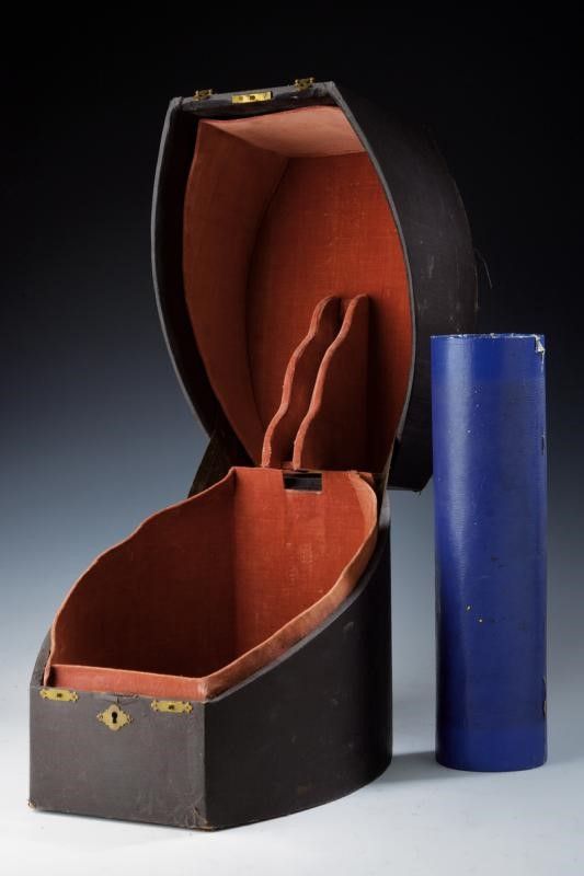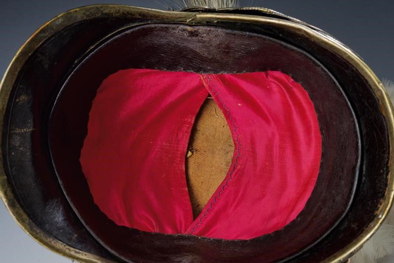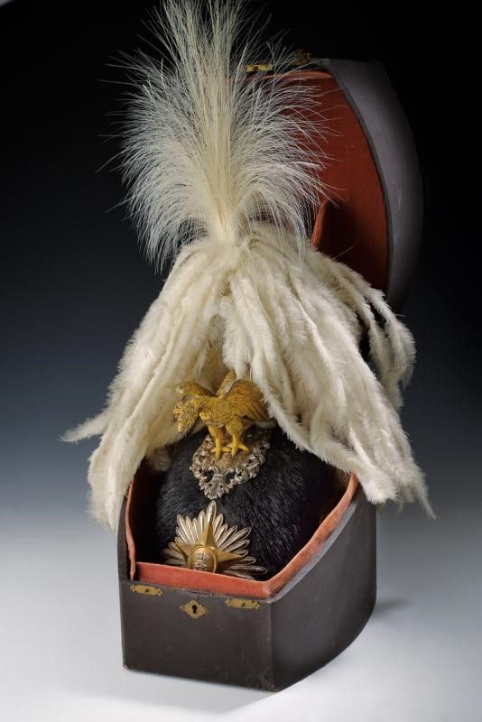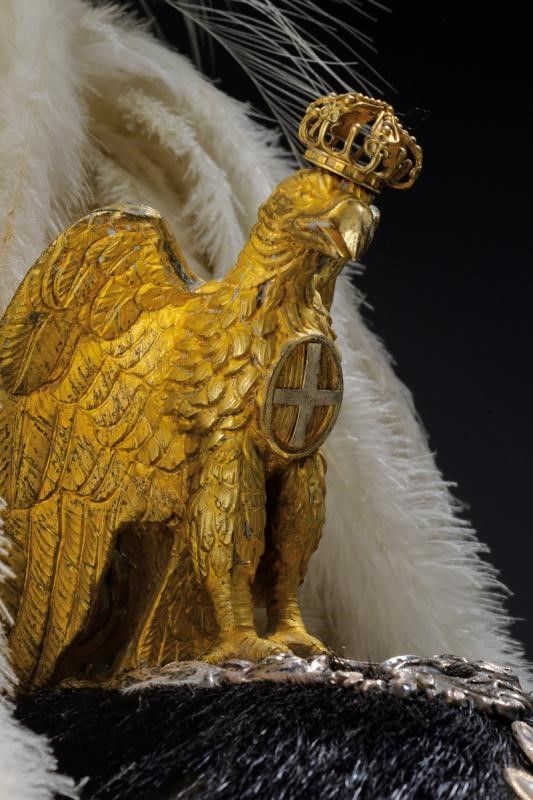 Regno d'Italia, altezza 27 cm. 1930 circa Coppo rivestito con pelliccia nera di foca (lacune e mancanze), tipico cimiero in ottone messo a giorno e dorato come pure l'aquila, questa lavorata a tutto tondo e caricata sul petto da croce in argento. Coccarda tricolore in seta e canutiglia argento. Tutti i fornimenti argentati, compresi i soggoli a squame e la raggiera frontale (con punzone di argentiere); stellone dorato recante il monogramma del re Vittorio Emanuele III. Interno con visiere in marocchino scuro come pure l'alluda, cuffie in seta rossa. Completo di bel piumaggio originale. Entro la sua bella custodia da viaggio in legno rivestito di marocchino nero con interno in velluto leggermente sbiadito.