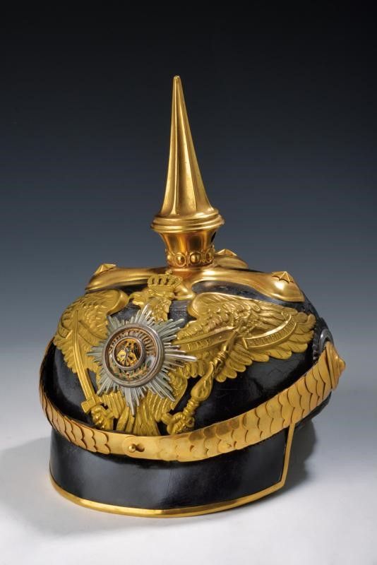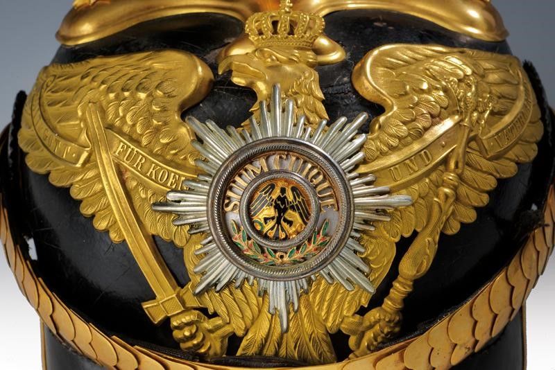 Prussia, altezza 26 cm. 1910 circa Elmo in cuoio laccato nero (un'intaccatura nella parte posteriore), tesa angolata, fornimenti dorati, puntale scanalato su croce con stelle. Fregio con aquila della guardia recante stella dell'Aquila Nera in argento, parzialmente smaltata. Soggoli convessi ed entrambe le coccarde. Alluda in pelle e cuffia in seta. Molto raro.
