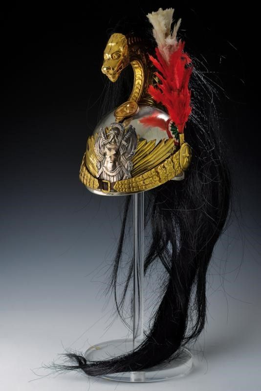 Repubblica Italiana, altezza 30 cm. 1947 circa Coppo in alpacca con fornimenti in ottone ben dorato, cimiero con tipici decori stampati in rilievo, ceffo a teste di leone con coda nera. Oliva con stella, raggiera dorata sormontata da trofeo d'armi in metallo argentato. Tipici soggoli a squame con orecchioni tondi con stella; coccarda tricolore in cotone, pennacchio originale rosso e bianco. Interno con visiere in marocchino bruno, alluda in coietto chiaro lavorato a spicchi. Il coppo marcato sotto il cimiero con il punzone di Eugenio Capriolo, capo armaiolo dei corazzieri.