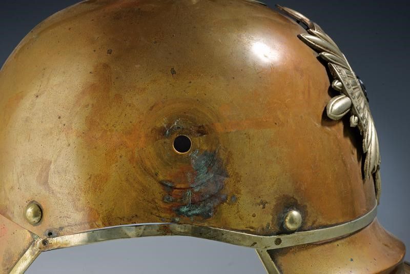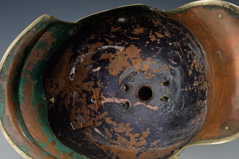 Prussia, altezza 28 cm. ultimo quarto del XIX Sec. Coppo, visiera e gronda in tombacco, bordi in argento; la sommità con puntale in tombacco su base ovale in metallo bianco; sulla fronte una grande stella dell'aquila nera, annerita al centro; mancano i soggoli e l'interno. Difetti.