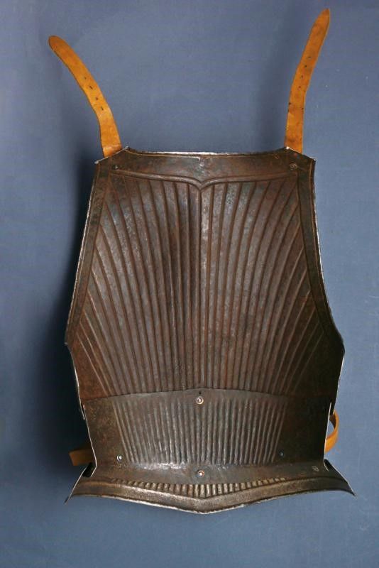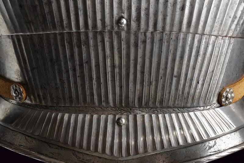 Anche la schiena realizzata in due pezzi, con fitta lavorazione sgusciata; la parte superiore en suite con il petto, i giri ascellari ribassati e con bordo rilevato e lavorato a fingere il tortiglione, la base della placca inferiore con banda incisa; lama di batticulo rivettata e lavorata nel solito modo.