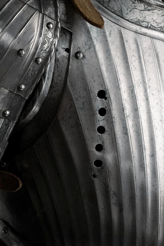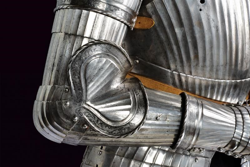 Bracciali completi lavorati e decorati en suite con sgusci e bande incise, entrambi gli spalletti con punzone di Norimberga e con un altro punzone non chiaramente leggibile. Questo recante probabilmente le lettere 'F” e “S' suddivise da un elemento centrale sormontato da un giglio, si tratta probabilmente del marchio dell’armaiolo. Nella seconda lama degli spalletti presente una decorazione centrale a forma di foglia con cordoncino rilevato al centro e lavorato a tacche circondato da un’area incavata e incisa. L’aletta della cubitiera sinistra con foro per ospitare un elemento per la giostra.