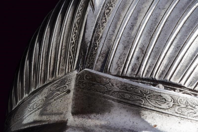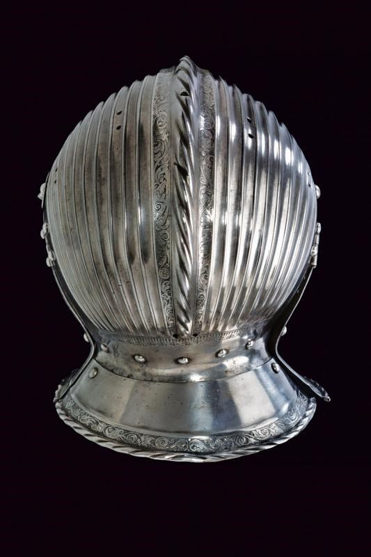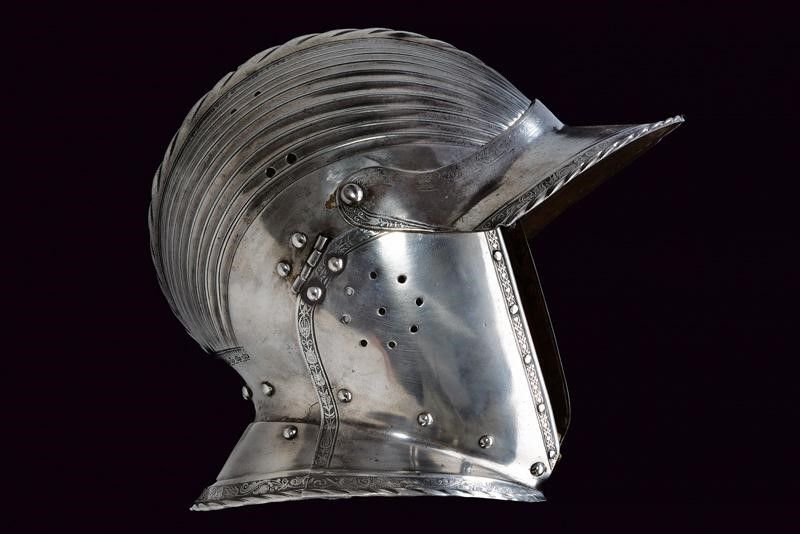 1520 circa Borgognotta con coppo martellato in un singolo pezzo, dotata di bassa cresta con profonde tacche a fingere il tortiglione. La parte superiore del coppo percorsa sgusci che corrono longitudinalmente; i due sgusci che costeggiano la base della cresta e il bordo anteriore del coppo incisi a volute su fondo nero granulato. La nuca, dove convergono gli sgusci, percorsa trasversalmente una banda dentata decorata con gigli. Tesa rialzabile, appuntita, costolata e in mezzeria, con lista ribassata e bordo lavorato a fingere il tortiglione, ornata su tutti i margini con una banda incisa. Guanciali mobili, con margine decorato en suite e con bordo inferiore lavorato a fingere il tortiglione. La lama di gronda lavorata en suite. Il retro del coppo con due fori per la pennacchiera (mancante).