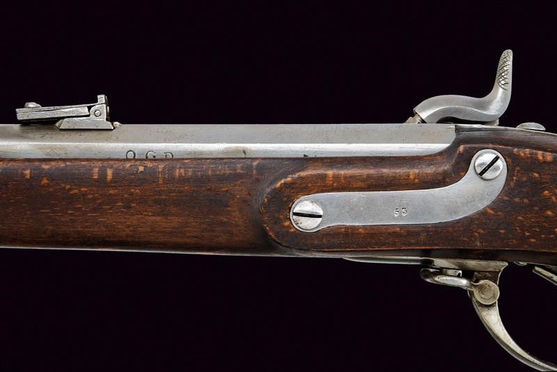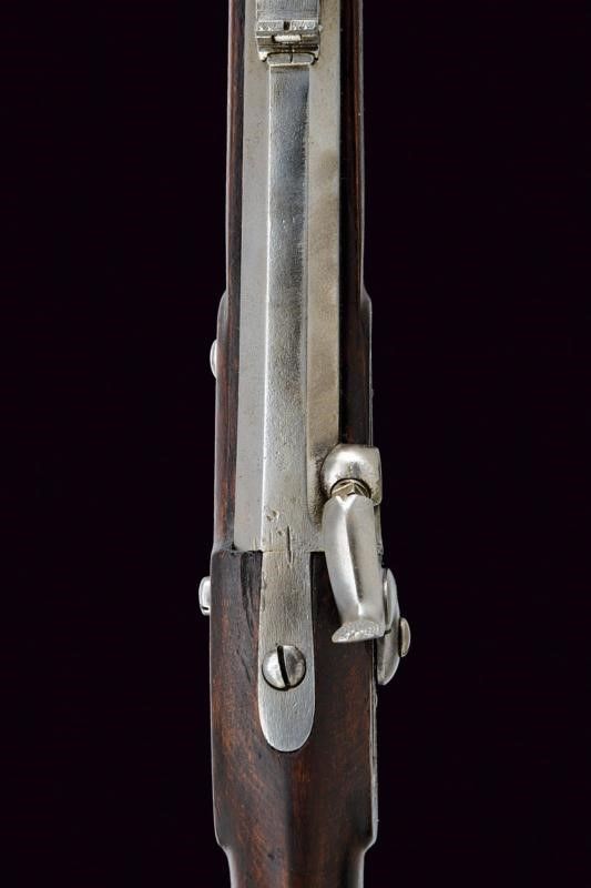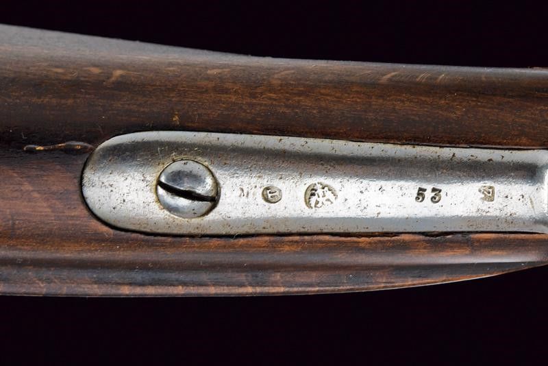 Austria, lunghezza 133.5 cm. 1855 circa Canna tonda, rigata, con base ottagonale marcata 'OGD' e con vari punzoni poco visibili, dotata di alzo abbattibile e mirino, cal. 13.9 mm. Batteria a molla in avanti marcata 'WANZEL WIEN'. Cassa intera in legno con fornimenti, bacchetta e baionetta a ghiera in ferro, munita di fodero in cuoio con fornimenti in ottone (lunghezza: 56.4 cm).