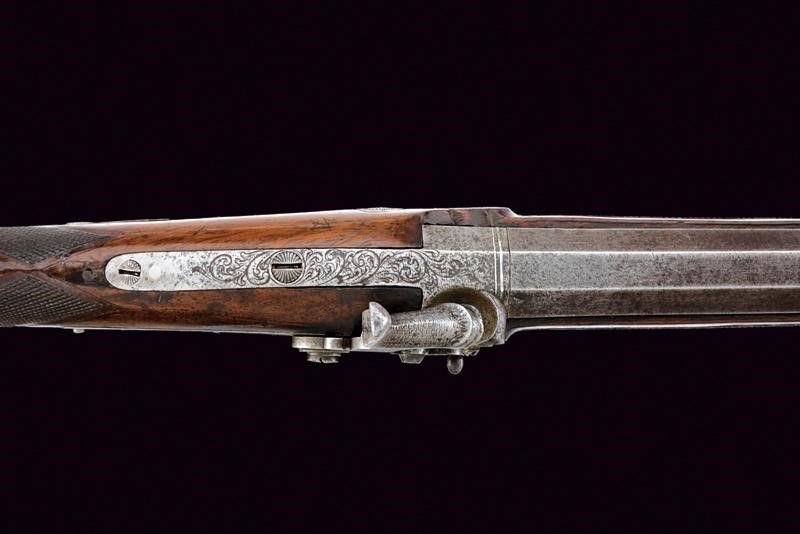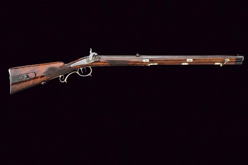 Germania, lunghezza 112 cm. Metà del XIX Secolo Canna ottagonale rigata, con base incisa e con doppia cornice in argento, alzo a due foglie e decorato con una freccia, mirino, cal 14 mm. Codetta incisa. Batteria a molla indietro incisa a volute e munita di sicura. Cassa intera in legno con collo e poggiano zigrinati. Patchbox con pistone e molla di ricambio. La guancia sinistra finemente scolpita a fiorame. Fornimenti in lega gialla chiara decorati en suite con la batteria. Stecher. Meccanica funzionate. Bacchetta in legno con battipalla in corno e cavastracci in ferro.