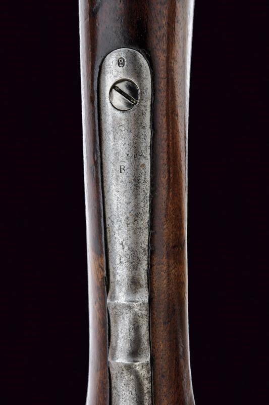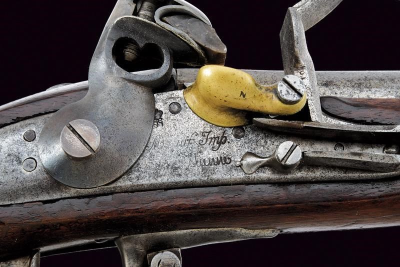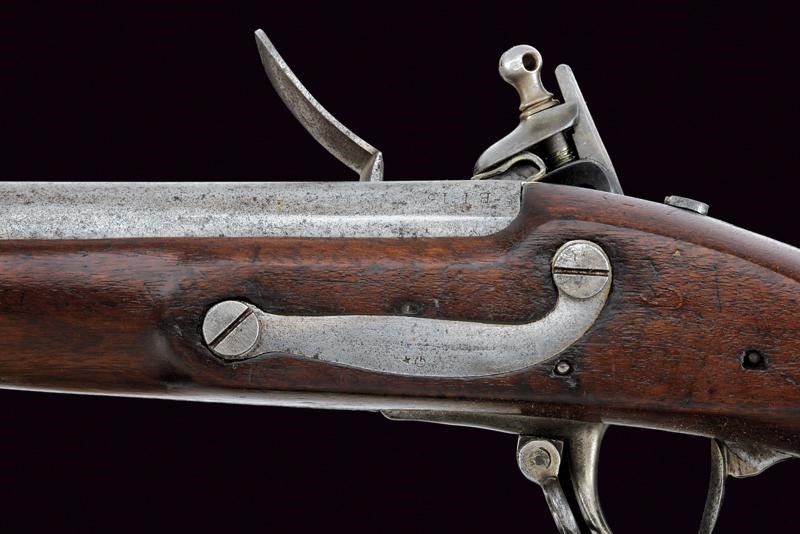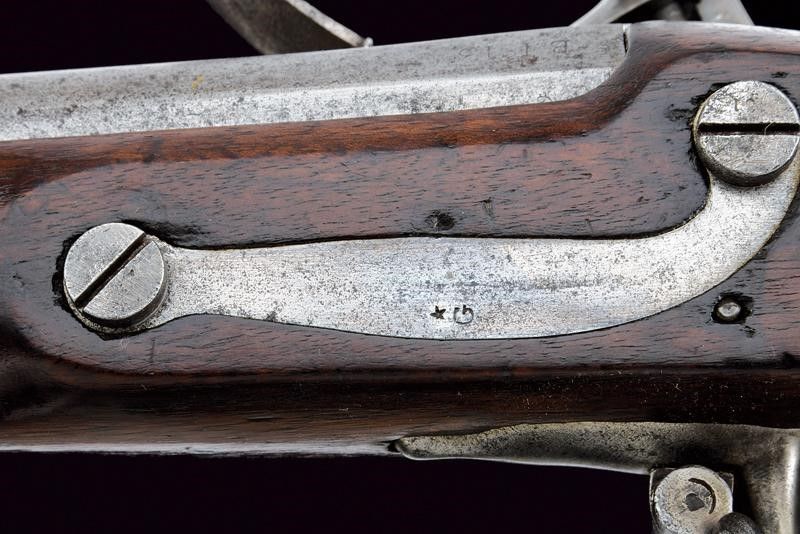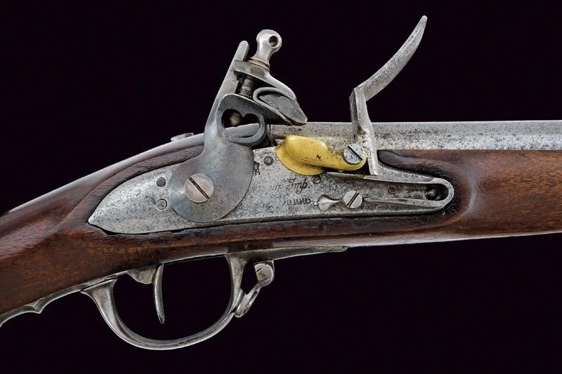 St. Etienne, lunghezza 123.5 cm. primo quarto del XIX Sec. Canna lisca, tonda, con base quadra, marcata 'V' sotto corona e con altre marcature poco leggibili; mirino in ottone, cal. 18 mm. Codetta con marcatura 'V' sotto corona. Batteria con marcatura della manifattura imperiale di St. Etienne, punzone e scodellino in ottone. Cassa intera in legno priva di fascette. Fornimenti punzonati in ferro. Bacchetta in ferro con battipalla in ottone. Raro.
