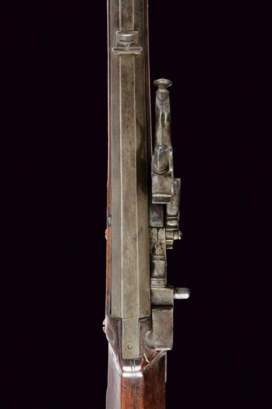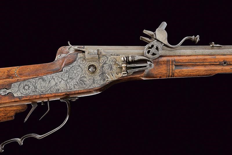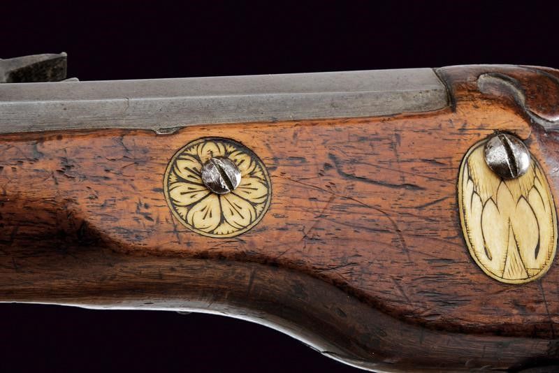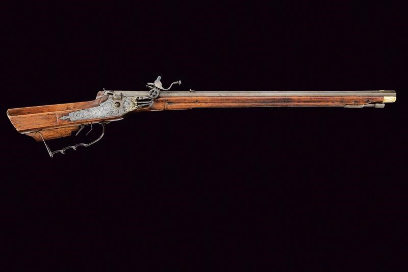 Germania, lunghezza 45 cm. ultimo quarto del XVII Sec. Canna ottagonale, rigata, munita di alzo e mirino, cal. 13 mm. Bella batteria ruota interna, con cartella finemente incisa con un pappagallo fra disegni floreali; il cane e la molla incisi e parzialmente traforati; copriscodellino scorrevole. Cassa intera in legno con parte inferiore del collo scanalata, leggermente scolpita al calcio. Placche decorative in osso inciso a motivi floreali. Patchbox. Ponticello anatomico in ferro. Stecher funzionante. La bacchetta in ferro sostituita.