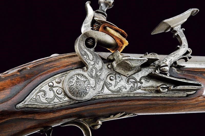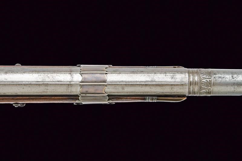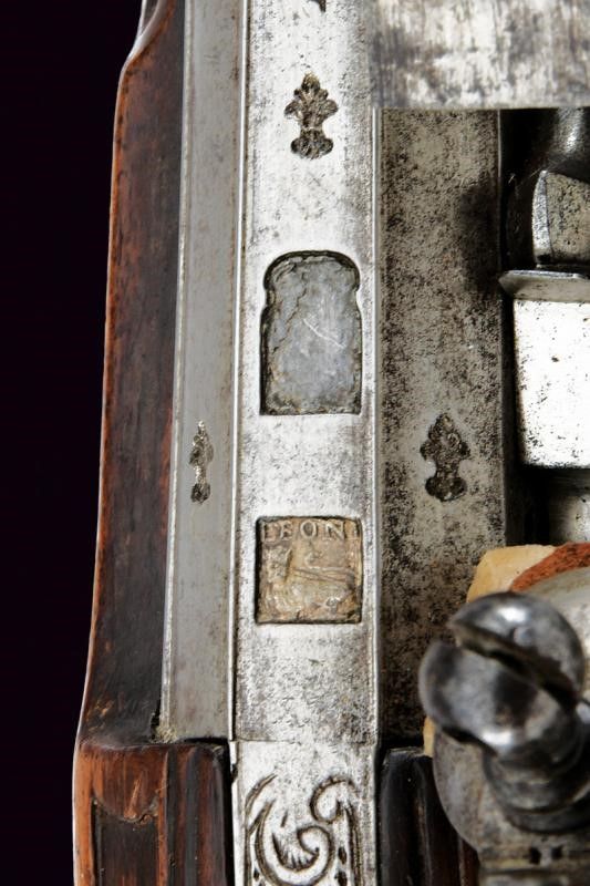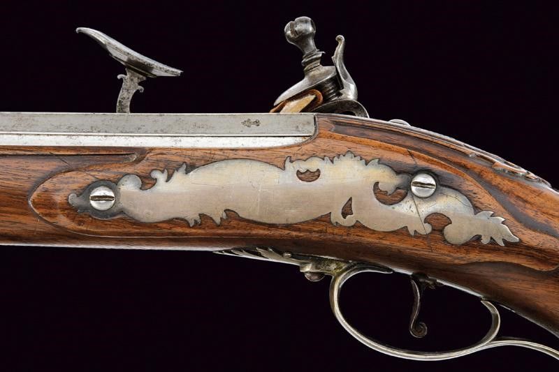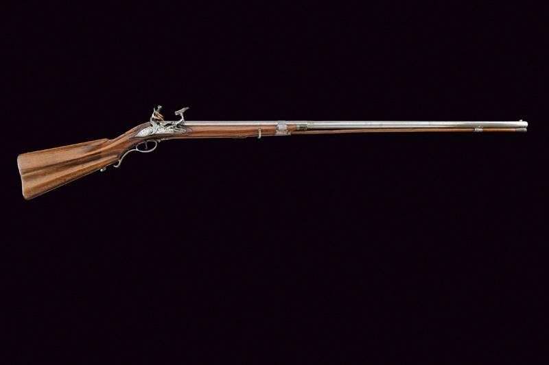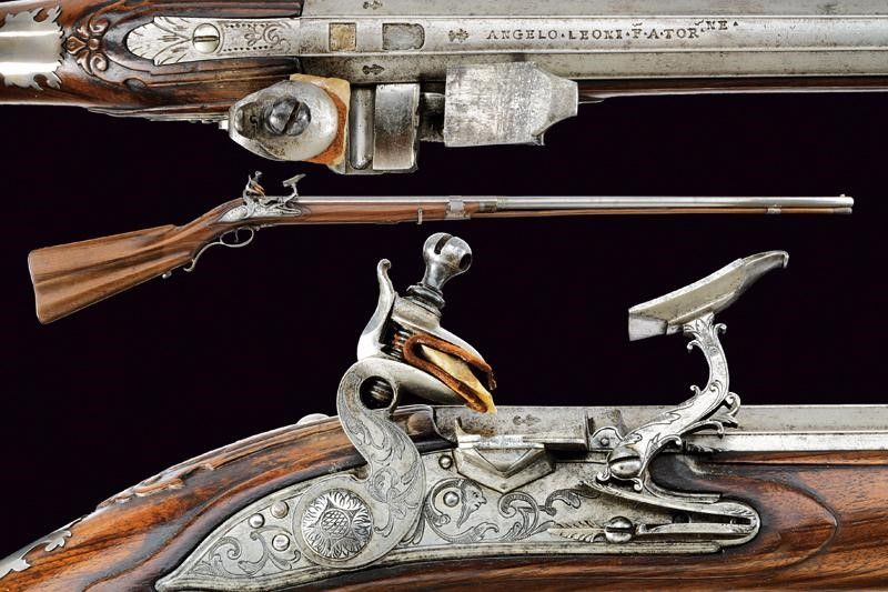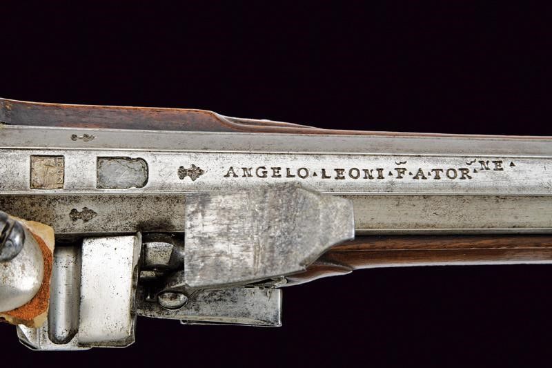 fine del XVIII Sec. Canna liscia a due ordini, ottagonale e tonda. Il primo segmento con nervature longitudinali, al dorso in culatta tre gigli, un punzone non chiaramente leggibile, il timbro 'LEONI' che sormonta un leone, poi la dicitura 'ANGELO LEONI F.ATOR.N.E'. Al cambio cornicetta a foglie d'acanto e anellature. In volata mirino in argento. Cal. 16,2 mm. Codolo con incisioni floreali. Batteria a cartella piana incisa a grottesche, di Pietro Tommasi. Mezza cassa in legno con fornimenti lisci in argento. Bacchetta in legno con battipalla in corno e cavastracci in ferro. Meccanica ben funzionante.