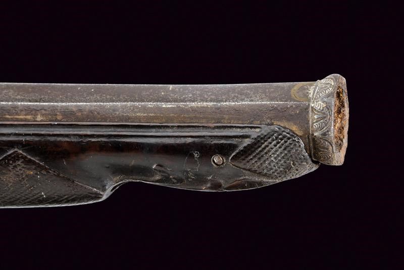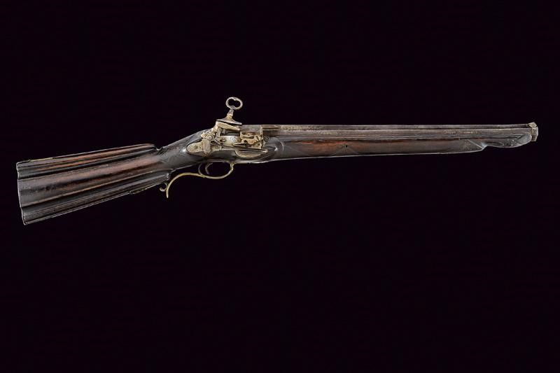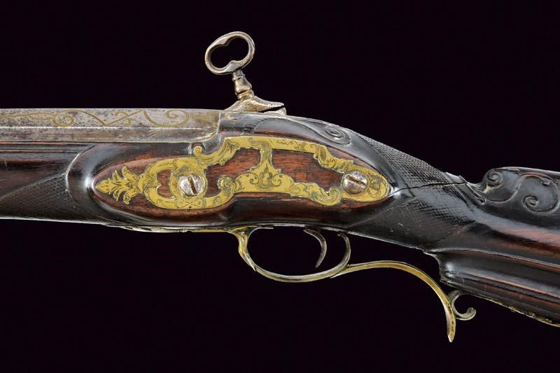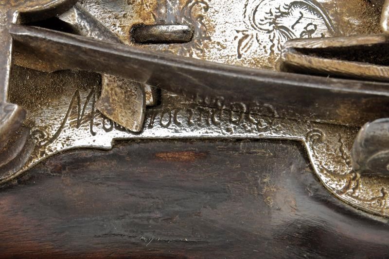 Italia meridionale, lunghezza 88.8 cm. 1819 Pesante canna corta, ottagonale e liscia, con estremità decorate a motivi floreali e rimesse in ottone, la volata con gioia di bocca incisa a fiorame, cal. 23 mm. Codetta incisa. Batteria alla micheletta firmata 'Moostocino' (? - non chiaramente leggibile) e datata '1819'; cartella incisa a motivi floreali; funzionamento da rivedere. Cassa intera in legno scolpito, con danni e parziale rottura al collo restaurata in epoca d'uso; astina e collo zigrinati. Bei fornimenti in ottone incisi a motivi floreali; la contropiastra traforata. Bacchetta mancante.