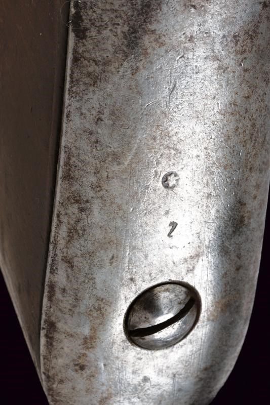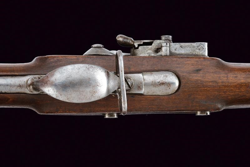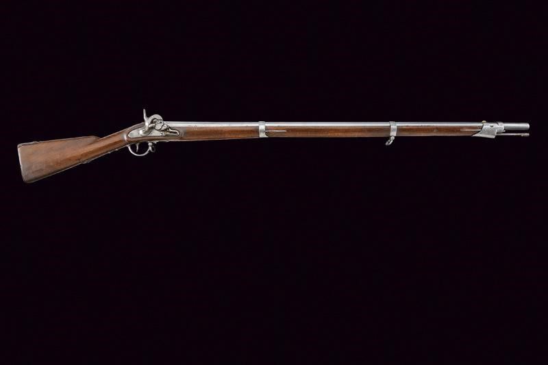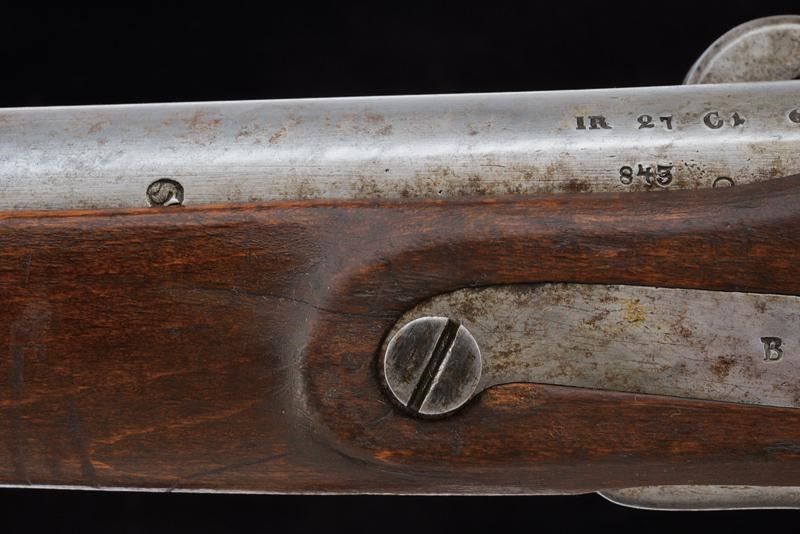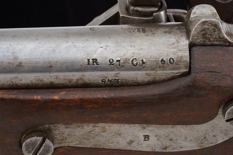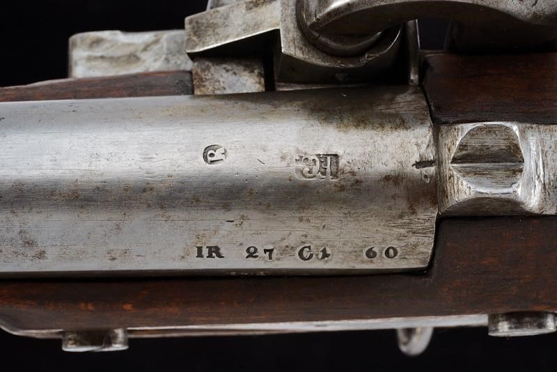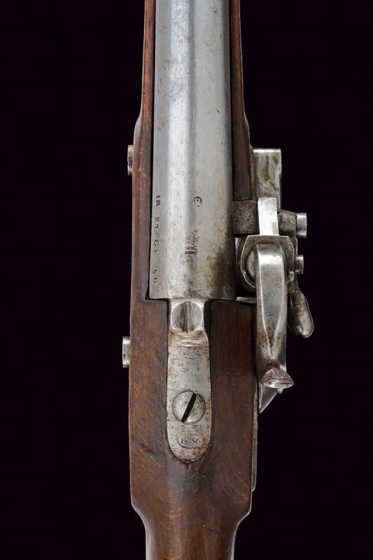 1843 Canna tonda liscia con base quadra marcata 'FG', 'R', 'IR 27 C 1 60', '843', 'S', sul lato 'WN' e con un altro punzone, dotata di mirino, cal. 17,8 mm. Codolo con alzo fisso marcato '1836'. Batteria con punzone imperiale e data '843'. Meccanica ben funzionante. Cassa intera in legno con fornimenti e bacchetta in ferro; vari punzoni 'R' e 'L'.